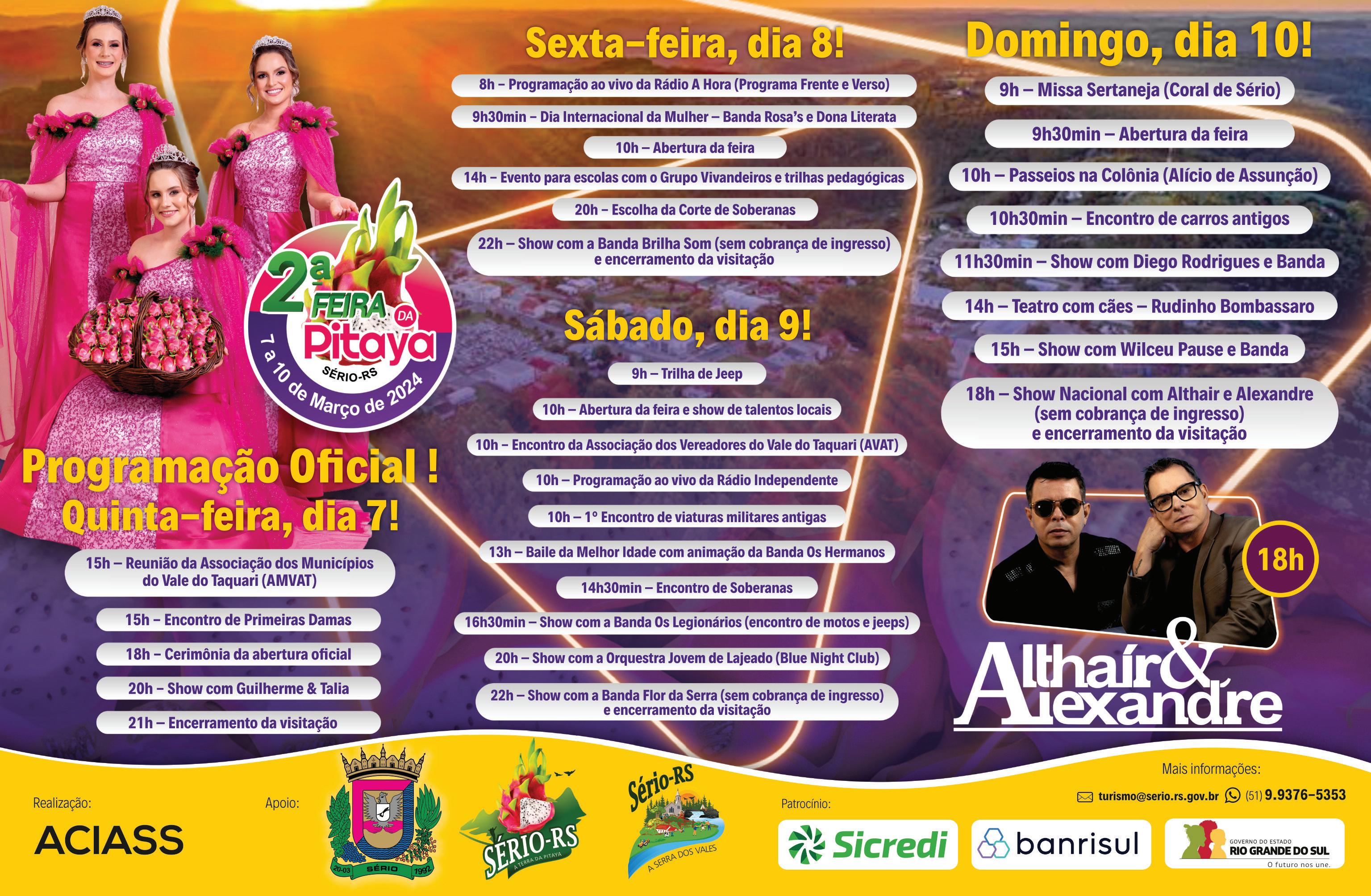 As festividades ocorrem no ginásio poliesportivo municipal, Salão Paroquial e arredores, no Centro, entre os dias 7, 8, 9 e 10 de março. A primeira edição do evento foi realizada em fevereiro de 2022. Informações pelo e-mail: turismo@serio.rs.gov.br ou telefone (51) 9.9376-5353 (WhatsApp).