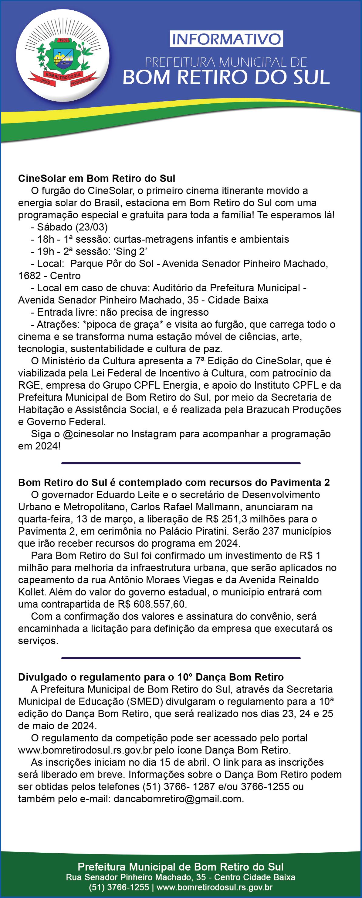 A programação comemora os 59 anos de Nova Bréscia entre os dias 10 e 14 de abril, com o Festival dos Gaiteiros, Churrasqueiros e da Mentira.