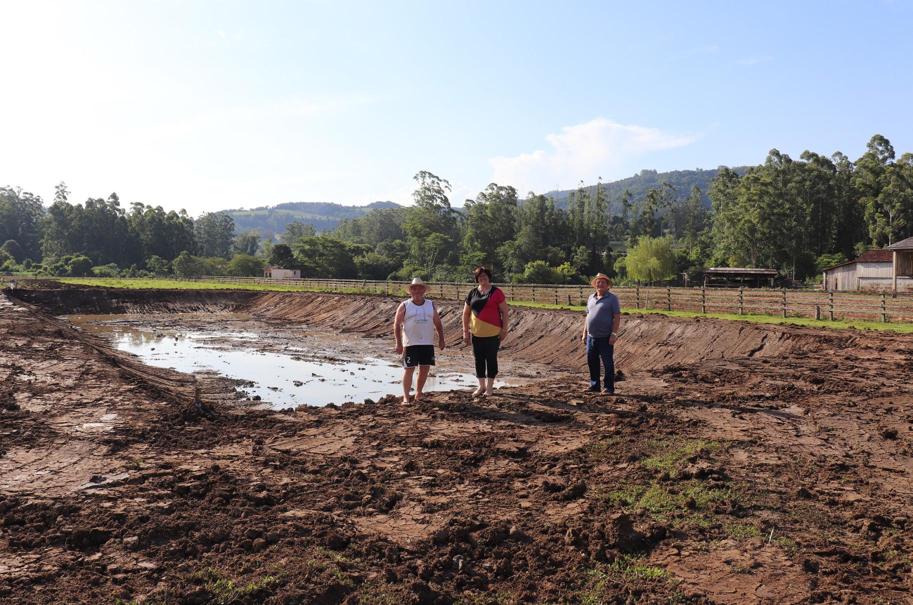 Poço das Antas é o primeiro contemplado com recursos no RS. Reservatórios foram planejados para reduzir prejuízos nas estiagensPrefeita e vice visitaram obras na propriedade de Roque Koerbes. Investimento é de mais de R$ 72 mil DIVULGAÇÃO
