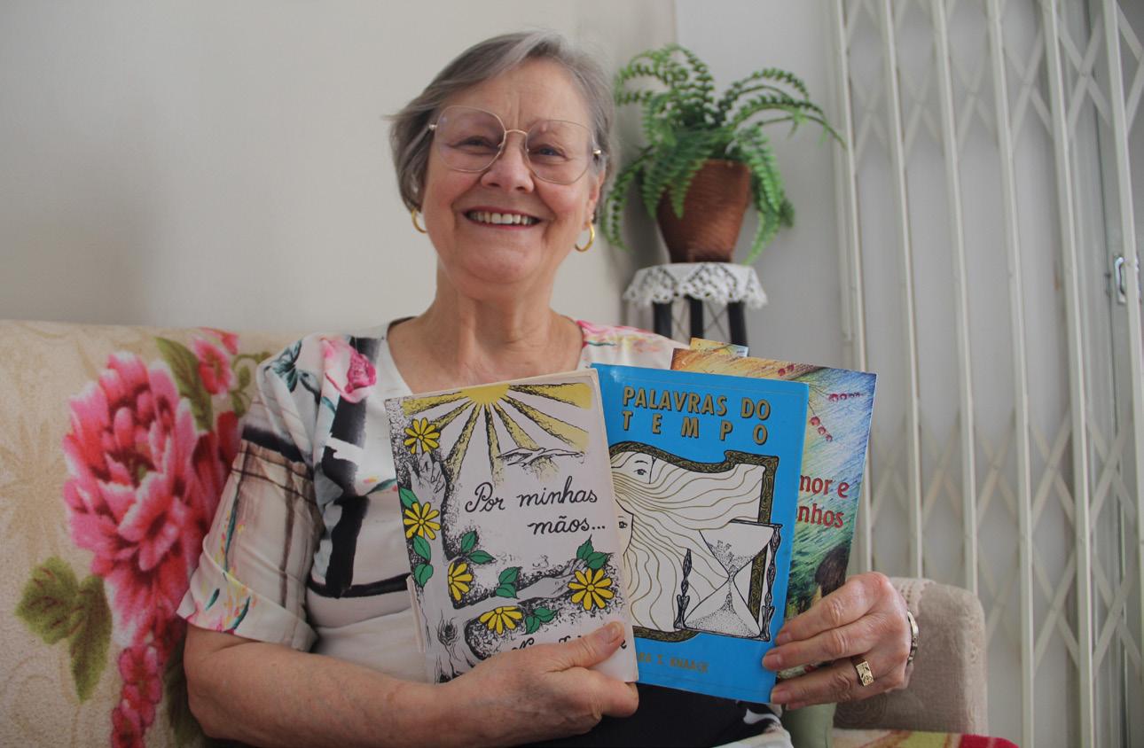 Professoraaposentada,Nara TeresinhaKnaack,70,sempre teveumapaixãopelaliteratura. Emespecial,apoesia.Publicou trêslivroscompoemasautorais. Oprimeirodelescompletou30 anosem2022,oqualrendeu homenagensnaFeiradoLivro deLajeado.Umadasfundadoras da Academia Literária doVale doTaquari(Alivat),mantémo hábitodaescritaaonarrar,emum caderno,ainfânciadaneta.