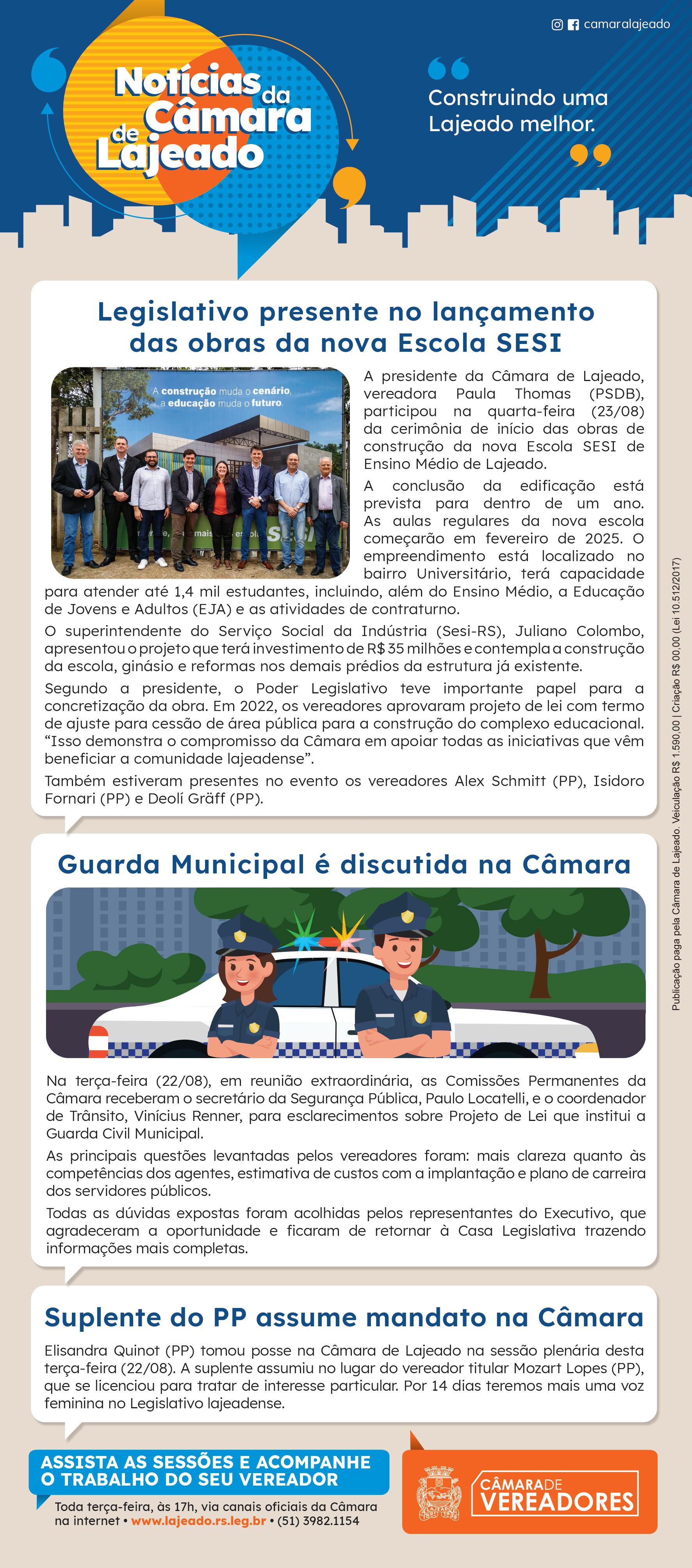 Em discussão na câmara de vereadores há cerca de um mês, o projeto de lei que autoriza a criação da Guarda Civil Municipal será tema de debate no programa Frente e Verso, da Rádio A Hora 102,9. A atração será transmitida direto do plenário do Legislativo e contará com a participação de nove entrevistados. Pelo governo de Lajeado, autor da proposta, participam os secretários de Segurança Pública, Paulo Locatelli, e da Fazenda, Rafael Spengler. Presidente da câmara, Paula Thomas representa o Legislativo. Do empresariado, estarão