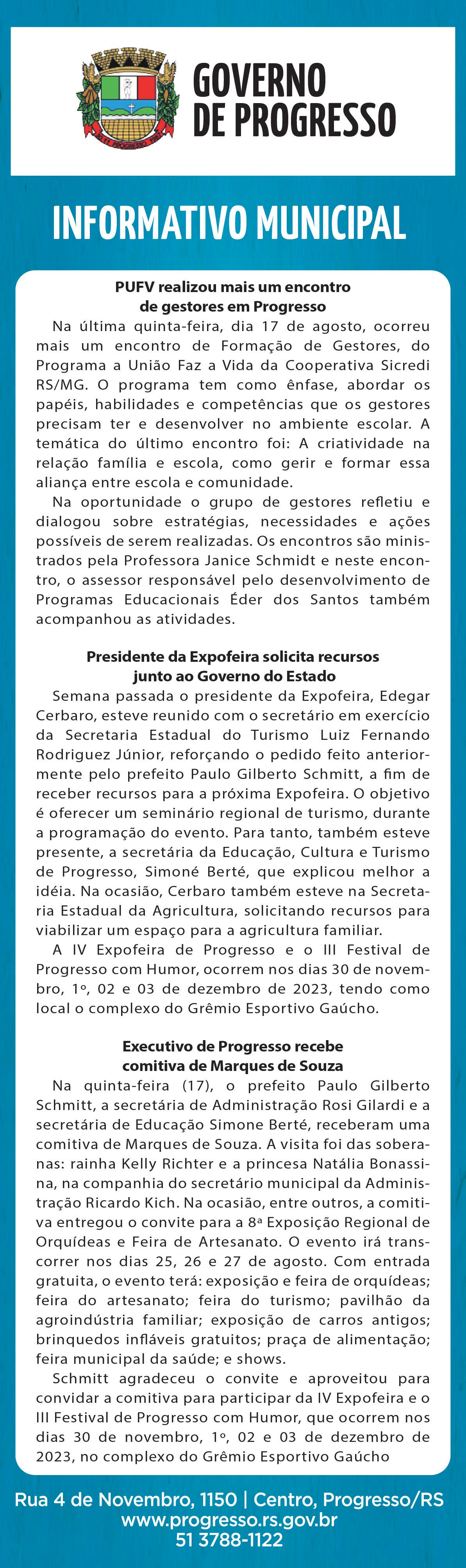Triagem de Campo Branco e um projeto para a construção de uma rede de água em Lajeado do Meio, mas que ainda não tem garantia. “Procuramos visitar todos os eleitos que têm representatividade em Progresso, independente do partido, pois como prefeito represento os interesses de toda a população”, salientou Schmitt, otimista com os resultados.