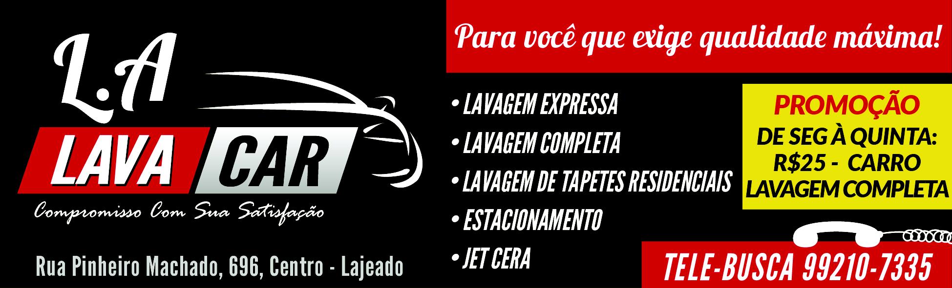 LA Lava Car - Estacionamento, Jet cera, lavagem (expressa, completa, tapetes residenciais). Lavagem completa de 2ª a 5ª R$ 24,00, 6ª e sab. R$ 30,00. Rua Pinheiro Machado, 696 Centro/Lajeado. Tele-busca(51)99210-7335
