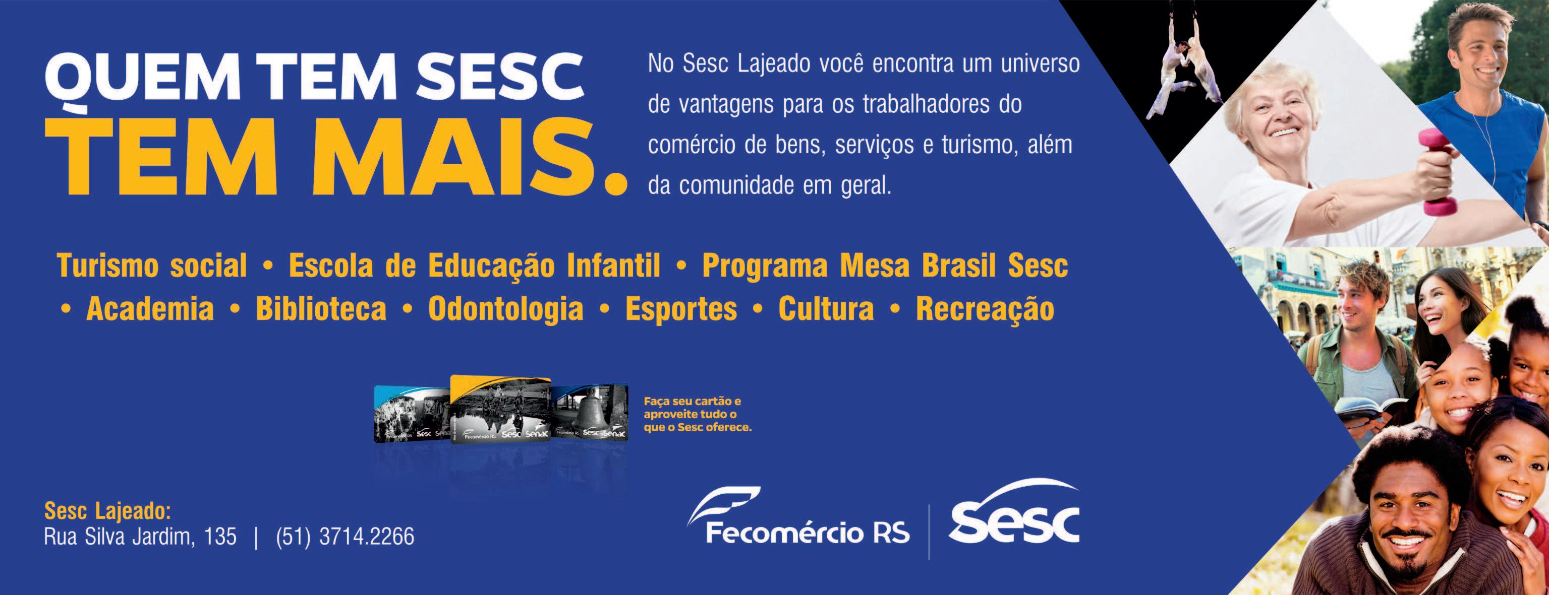 A Biblioteca do Sesc, de Lajeado, divulga o livro Top da Semana. Mais informações sobre o espaço podem ser obtidas junto ao Sesc Lajeado (rua Silva Jardim, 135) ou pelo 3714-2266. No RS, o Sesc está presente nos 497 municípios com atividades sistemáticas em áreas como saúde, esporte, lazer, cultura, cidadania, turismo e educação. Dessa forma, desempenha o papel social assim como o Senac/RS o da qualificação profissional do Sistema Fecomércio-RS que atua em âmbito econômico, político e social pela constante qualificação e crescimento do setor terciário gaúcho.