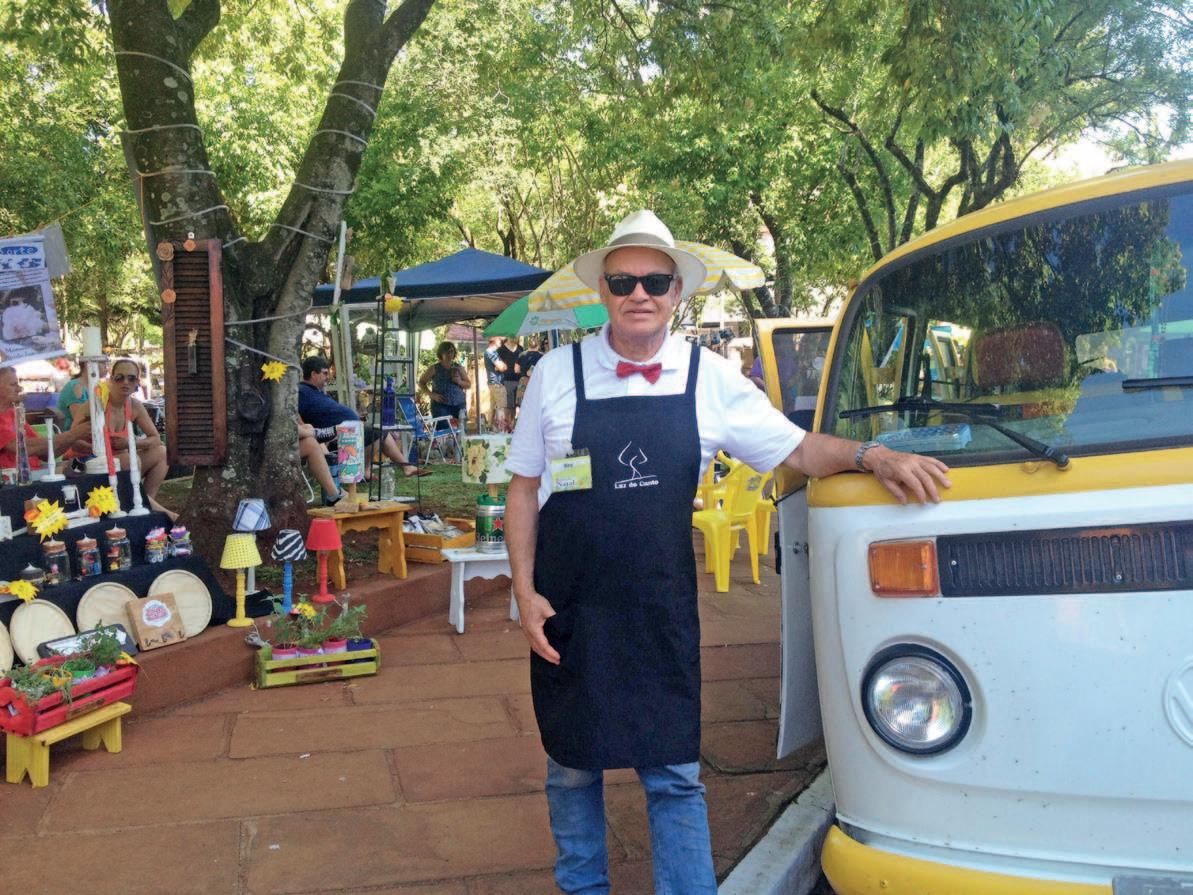 Todo segundo sábado do mês, o aposentado Ubirajara do Canto Marques, 65, viaja de Gravataí a Lajeado para participar do Arte na Praça. Na Kombi bicolor, carrega o artesanato feito a partir de madeira, vidro e ferro descartado. Pelas mãos do “Bira”, como é conhecido nas feiras, surgem luminárias, quadros para lavabos e pequenos vasos para flores. “Brinco de ser artesão. Acredito que tudo pode ser transformado.”