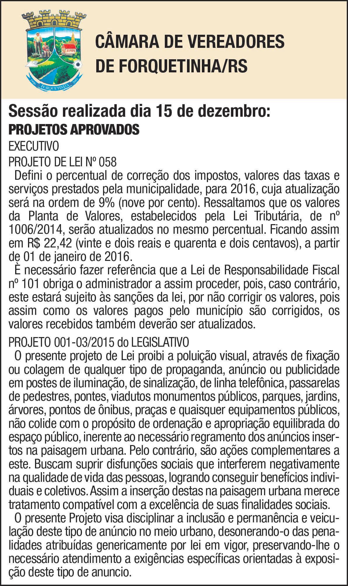Após a realização da Sessão Solene, ocorreu a última Sessão Ordinária do ano de 2015, onde foi novamente empossado o Vereador Sérgio Backes do PP, que renunciou ao cargo de Secretário de Estradas. Com a volta do Vereador, o Suplente Ubirajara Marques, do mesmo partido, deixa de ocupar o posto.