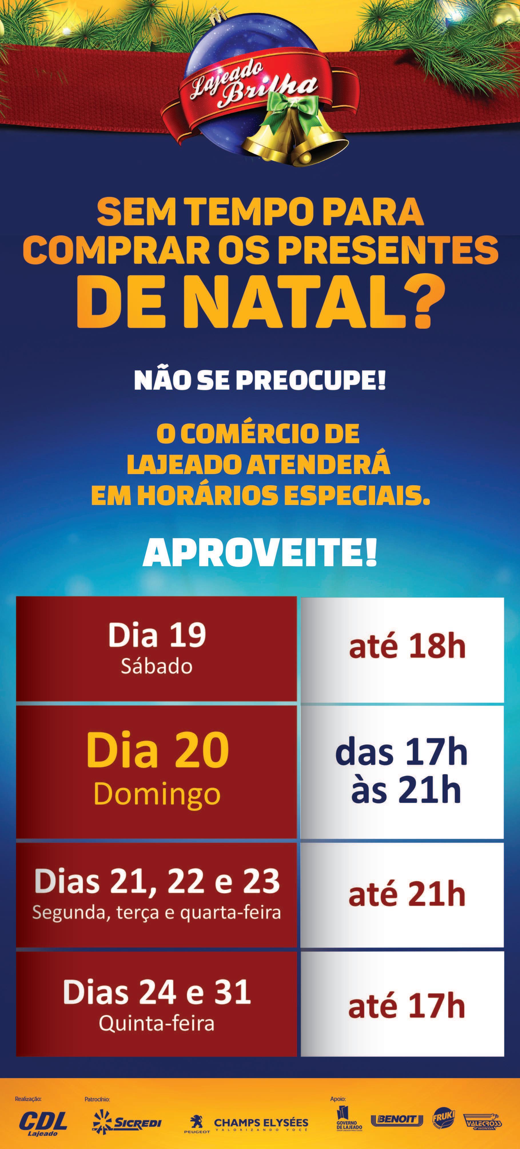 Jucatra e do coral Novo Brilho. Depois se apresenta a Orquestra Municipal, seguida da chegada do Papai Noel, show de fogos e música ao vivo com a banda Cássio Santos e Gang Sertaneja.