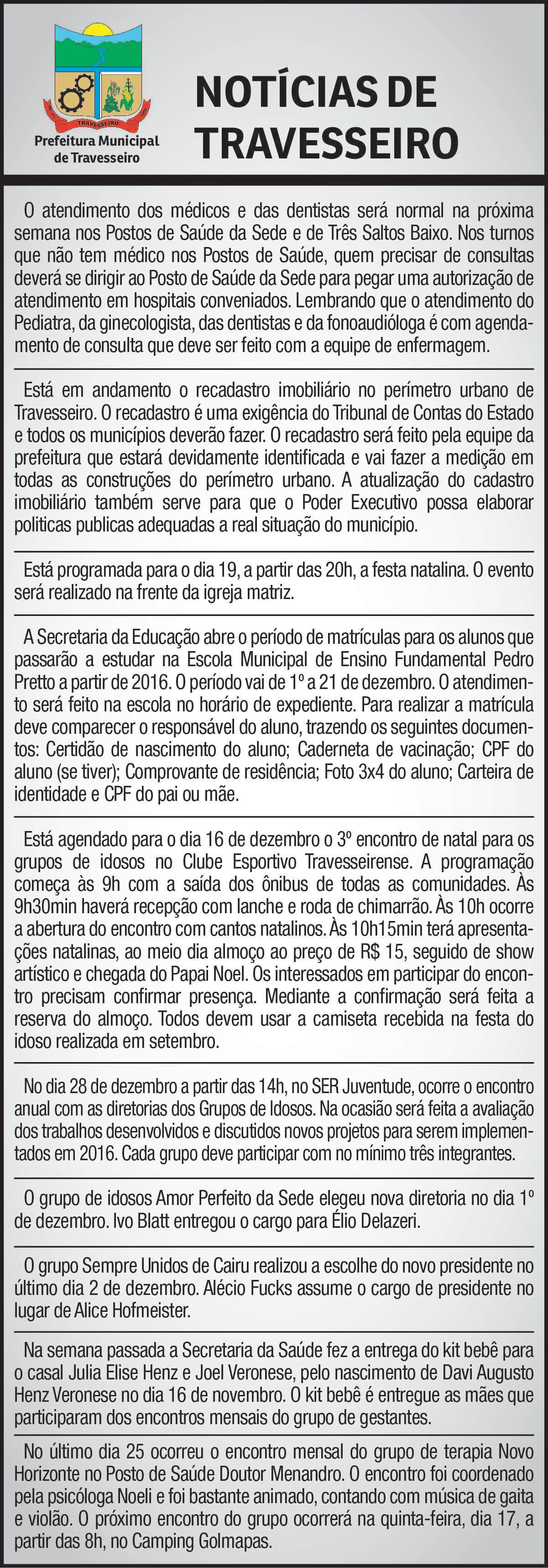 Em Travesseiro, o Executivo realiza a 13ª Noite de Natal em frente à Igreja Matriz, a partir das 20h deste sábado. Entre as atrações, estão o sorteio de prêmios das campanhas Travesseiro Dá Prêmios e Travesseiro Produzindo Mais.