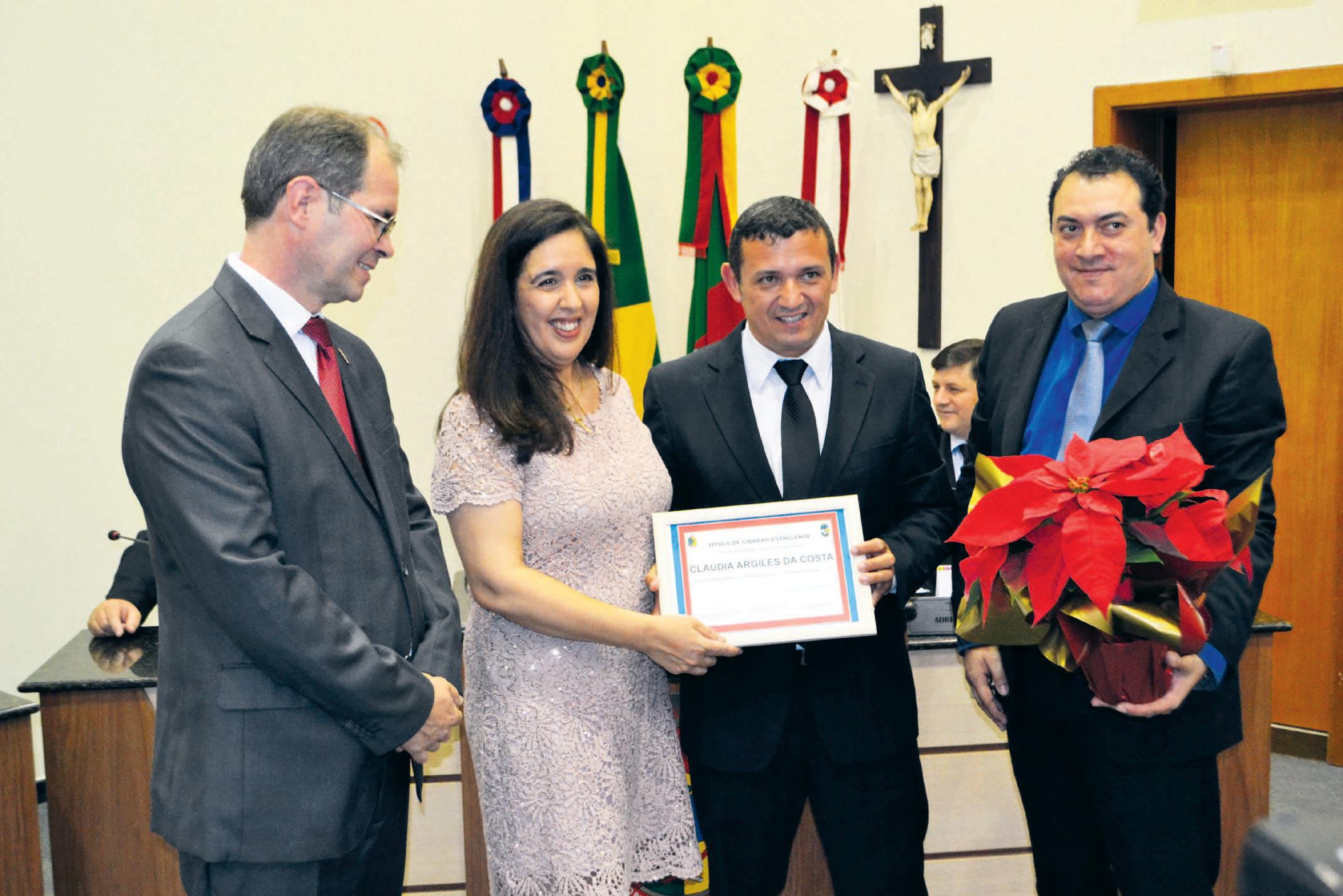 Oplenário da câmara ficou lotado nessa segunda-feira, 7, para sessão solene em homenagem à professora Claudia Argiles Costa. Moradora do município desde setembro de 1989, Claudia recebeu o título de Cidadã Estrelense pela atuação na área da educação, em proposição do vereador Gerson Adriano da Silva.