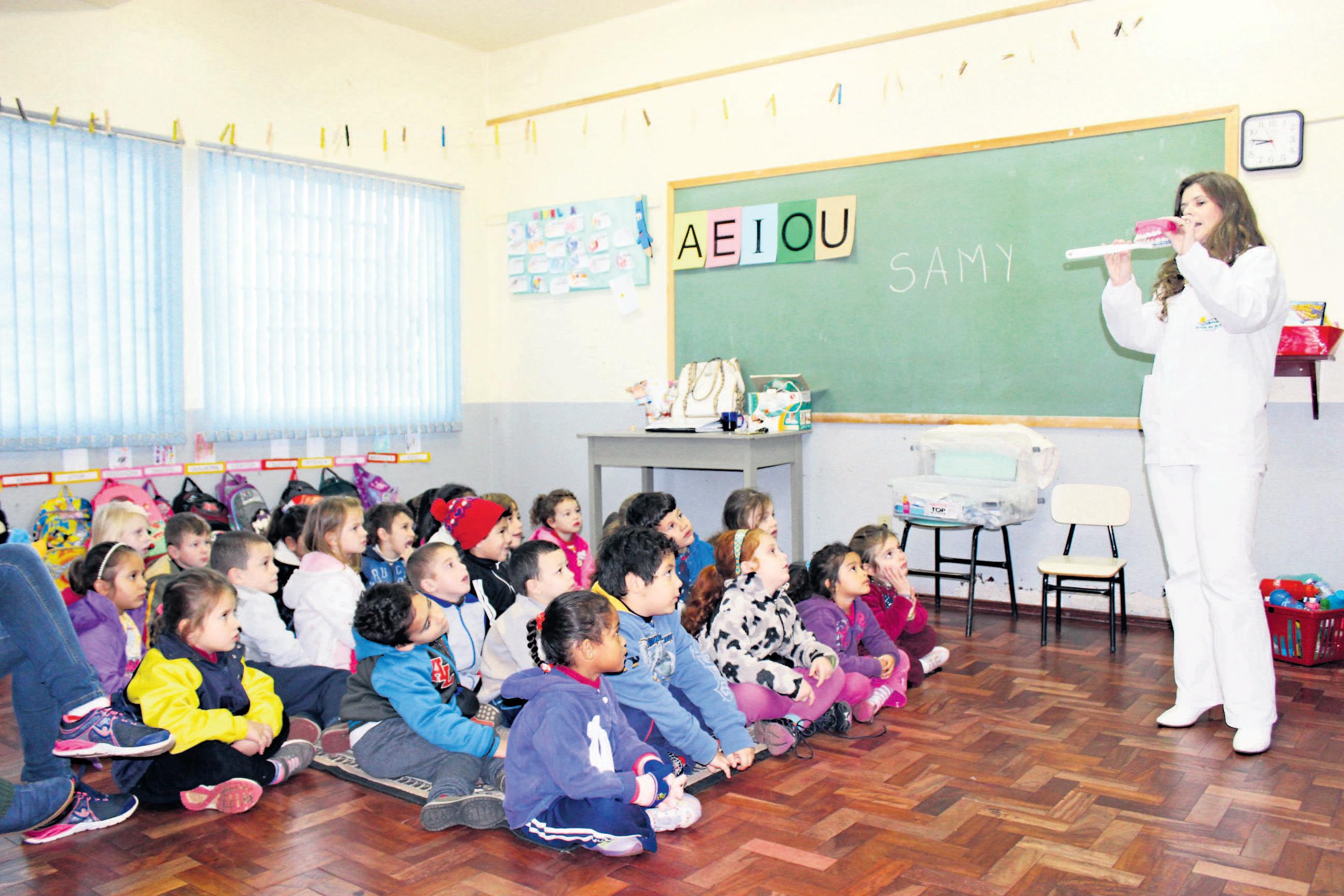 ASecretaria de Saúde percorre até o fim do ano 13 colégios para desenvolver o projeto de Saúde Preventiva Bucal. Durante os encontros, que na primeira etapa beneficiam estudantes do nível A e 1º ano, são realizadas palestras e distribuídos kits odontológicos, contendo fio dental, escova e creme dental, além de uma cartilha lúdica com o título “Cuide dos seus dentes e ande sempre contente”. O trabalho é acompanhado pela dentista Juliana de Oliveira. Até dezembro serão atendidos 1,3 mil estudantes da rede municipal de ensino. Durante as palestras, Juliana fala sobre a importância do uso correto de creme e fio dental, escovação, controle e frequência no consumo de açúcares e carboidratos.