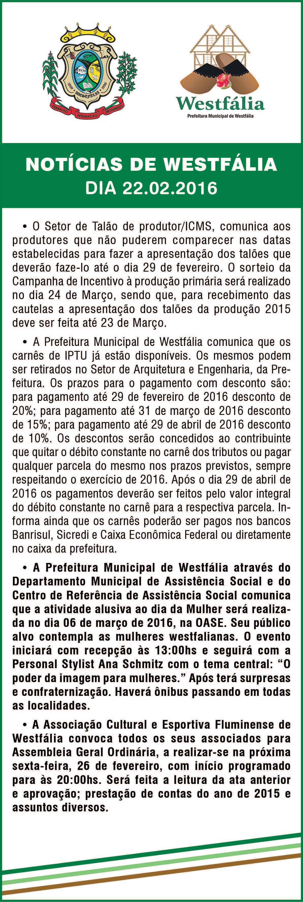 8h – Encontro Regional do Departamento de Assistência Social do Estado – Local: câmara de vereadores; 14h – Turma do Pirulito; 14h – Abertura Oficial da Feira da Agroindústria Familiar e Solenidade de Inauguração das Agroindústrias do Município