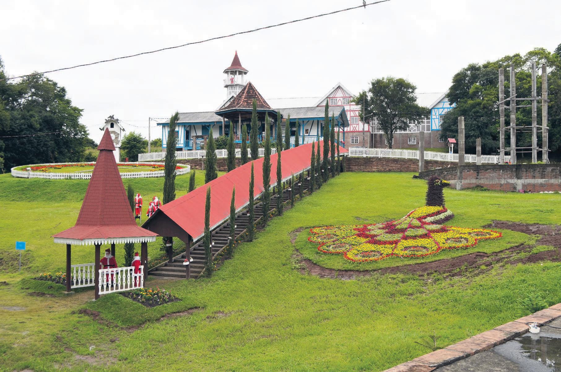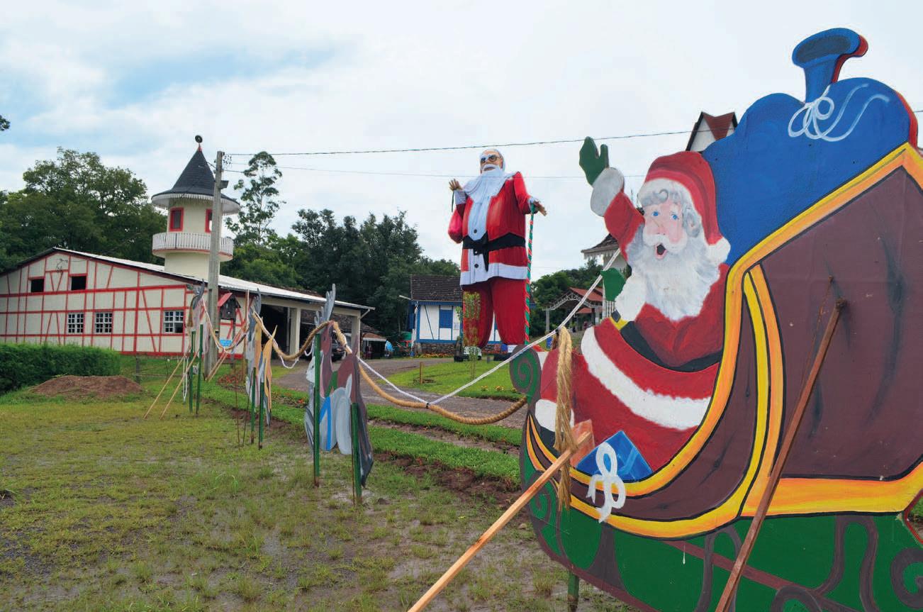 chter, escritos em português e alemão explicam cada cenário. “O que me impressiona é um momento de diálogo entre pais e filhos. Eles contam como era o Natal e como é hoje.” Para o prefeito, o cenário ultrapassa a fantasia das luzes com o fator histórico. Tão logo a visita à chaminé termina, surge o primeiro cenário religioso. A história do nascimento de Jesus e o drama de Maria e José estão impressos em cenários. A hospedagem negada e o estábulo. Estatuetas de José, Maria e do Menino Jesus, num cocho de mais de cem anos esculpido numa madeira de lei, são o presépio da sagrada família. Na parte mais alta, a torre panorâmica é atração à parte. Subir até em cima é a oportunidade de ver todo o parque. Próximo dali, uma homenagem à figura folclórica dos germânicos: o thiltapes. Há uma trilha em meio à vegetação, com muita sombra e esconderijos. A figura imaginária dos