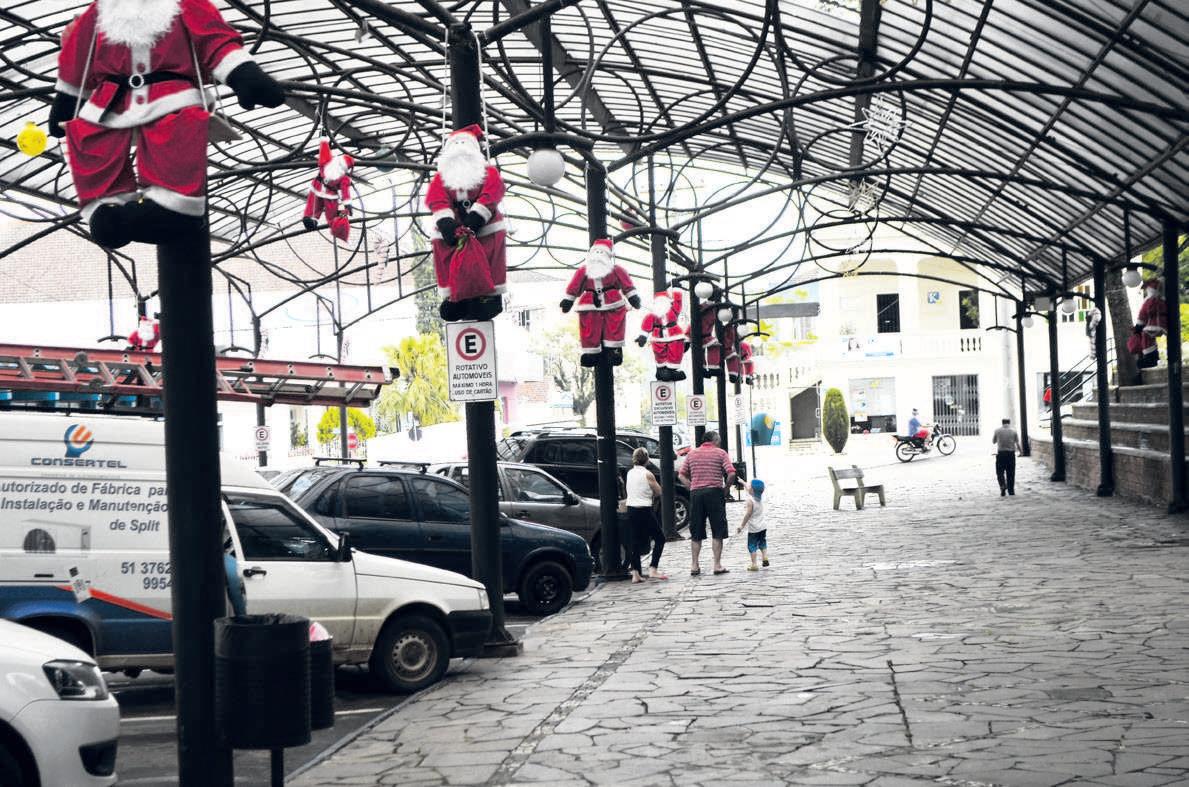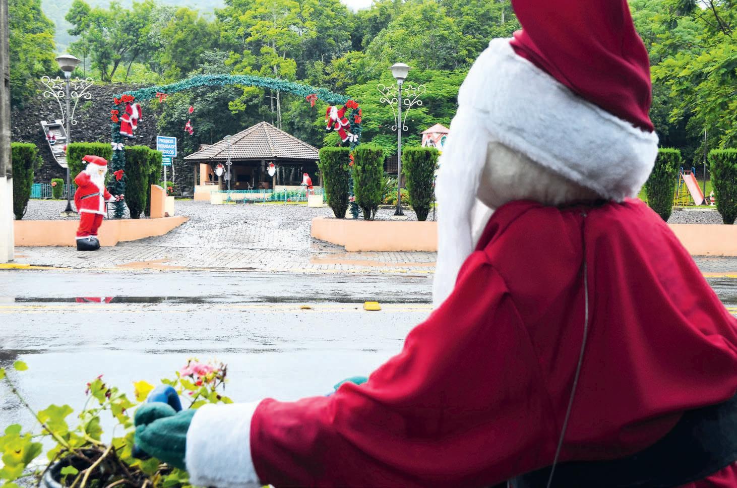 Cerca de cem Papais Noéis estão espalhados pelo centro. Pelas praças e parques, eles estão em formas inusitadas, de bicicleta, paraglider, Fusca, dando boas-vindas ou mesmo pendurados em postes. O vermelho dos trajes natalinos contrasta com o verde dos jardins decorados das residências.