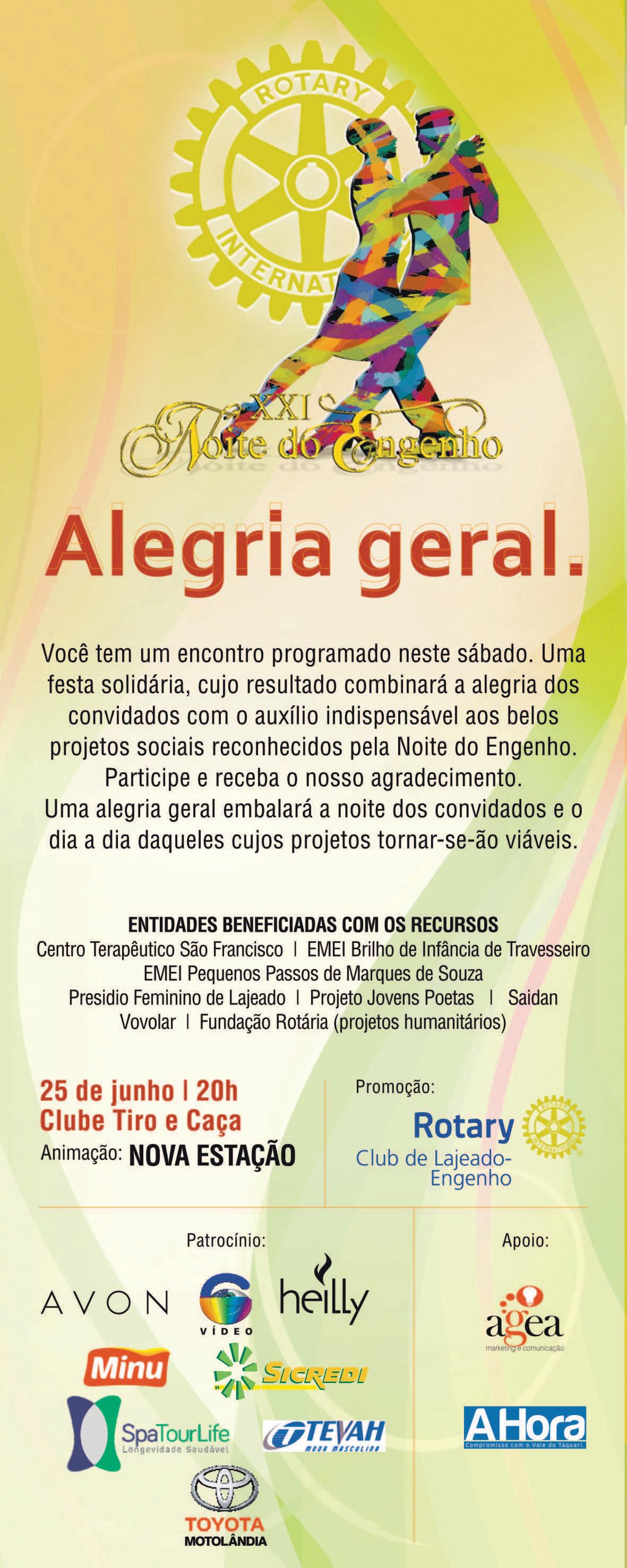 nas de trânsito, esportivas e artísticas. A Academia Literária do Vale do Taquari (Alivat) estará no local fazendo atividades relacionadas à produção de textos. O evento é gratuito. Em caso de chuva, será transferido para o próximo domingo.