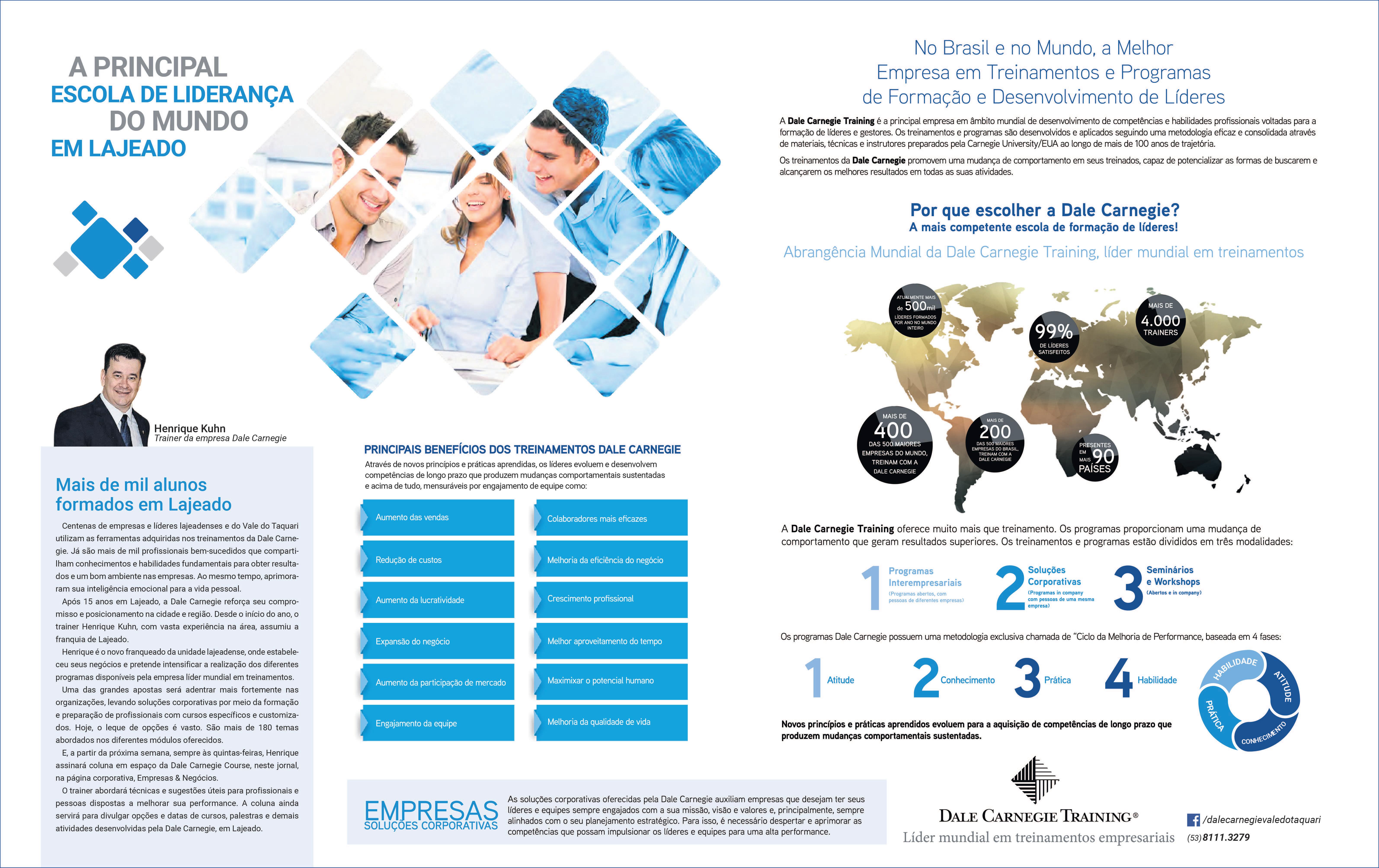 A Dale Carnegie Course é referência em escola de liderança no mundo e atua em 90 países. Desde sua fundação, formou mais de nove milhões de pessoas.