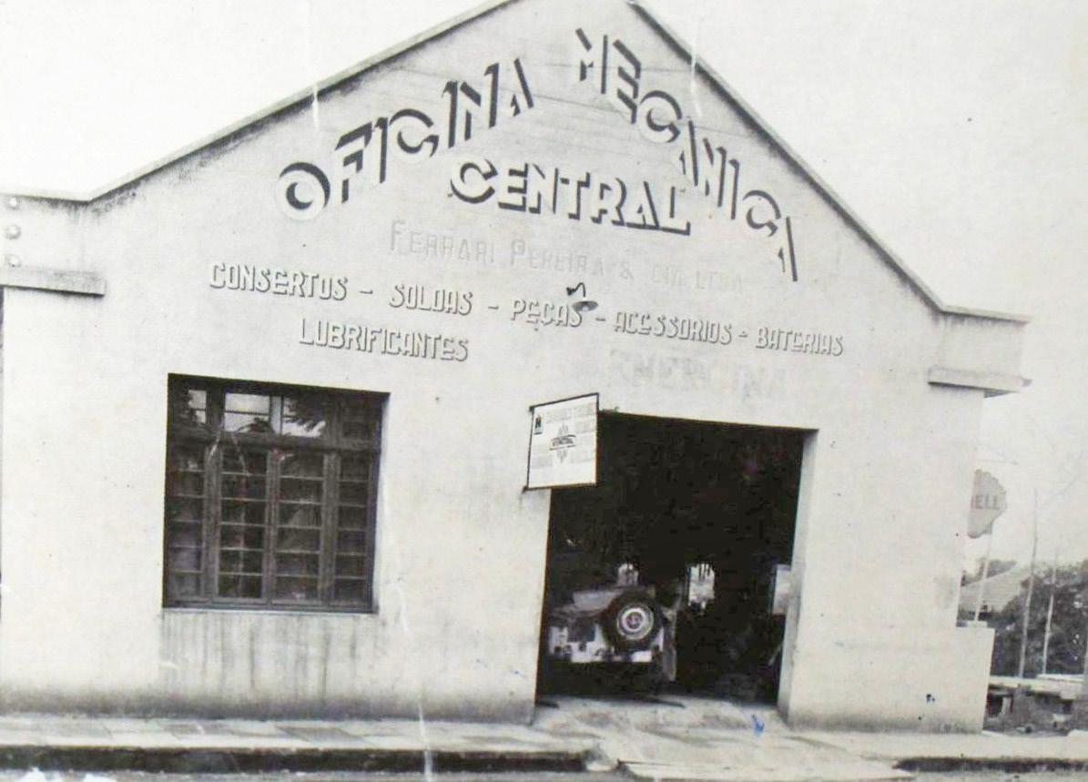 A foto é de 1945, quando a empresa trabalhava com reparos e manutenção dos poucos veículos que existiam em Lajeado