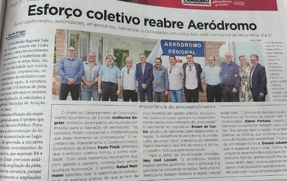 Adevolução da área do Aeródromo Regional do Vale do Taquari a municipalidade de Estrela é o primeiro passo para a privatização do espaço. Durante o programa Frente e Verso da Rádio A Hora, na terça-feira passada, dia 9, os representantes da Empresa Pública de Logística Estrela (E-Log) – a mantenedora do aeródromo e do complexo portuário – deixaram transparecer ao fim da entrevista que a concessão ao setor privado é um dos propósitos do governo estrelense. Eu ex-