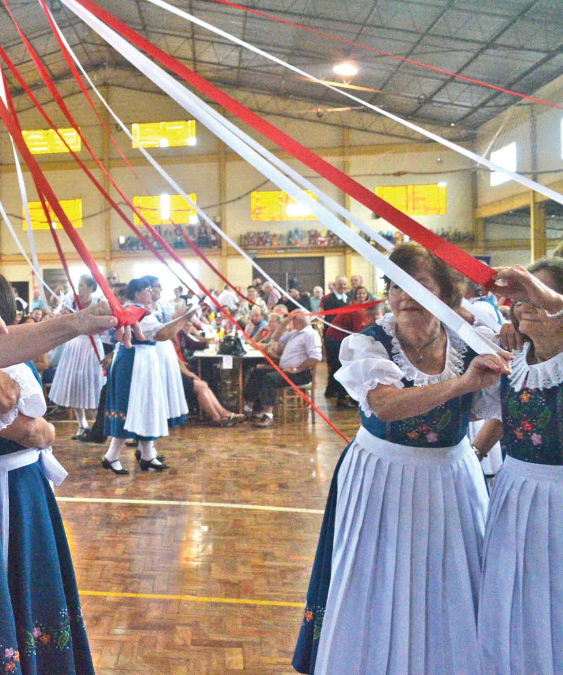 rer do evento. “Tivemos resultados muito bons, além do esperado. Em cerca de 40 minutos, conseguimos servir quase 800 pessoas. As pessoas gostam disto”, aponta A festa contou com apresentação do grupo de dança Blumenkranz após o almoço. Foram mais de 40 dançarinos que levaram ao público coreografias e músicas de origem alemã. Ao longo da tarde, a animação do baile ficou por conta do Musical Novo Encontro. Com o encerramento das atividades da festa anual, a comunidade inicia as preparações para o Baile de Kerb, que ocorre em 27 de julho. O evento terá animação da Super Banda Choppão e Jardel Amorim & Cia. A comemoração será em