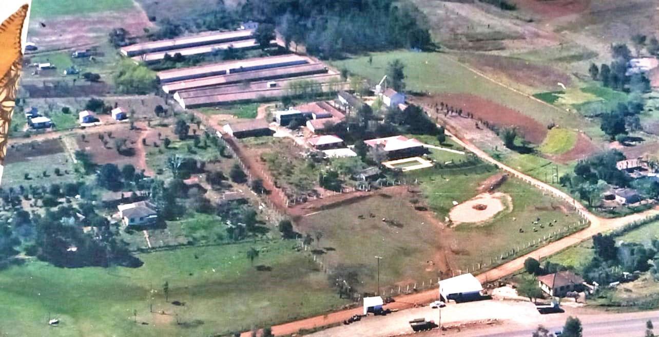 Foto aérea da década de 1970, bairro Centenário. A BR-386 está na parte inferior, acima, a rua Paulo Emílio Thiesen, ainda em estrada de chão. Ao fundo, os antigos aviários da família Ely, quase na divisa com o Olarias
