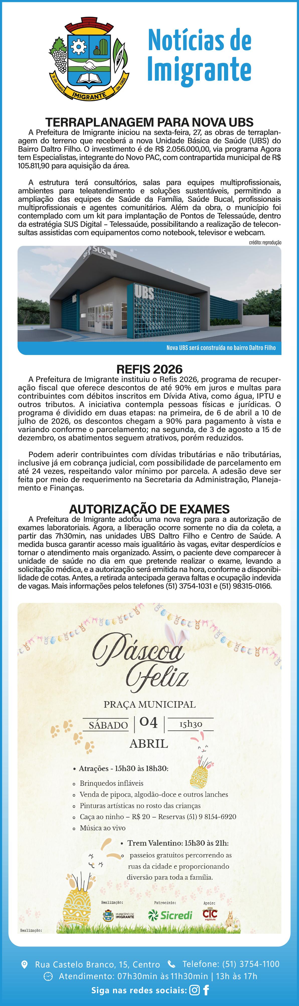 O município promove no dia 4 de abril, um sábado, véspera da Páscoa, a primeira edição da “Páscoa no Parque”. O evento ocorre no Parque Municipal Pôr do Sol e tem organização do gabinete da primeira-dama Fabiana Ferreira Frohlich, da Secretaria de Turismo, Esporte Lazer e Cultura, em parceria com as secretarias de Educação, Obras, Saúde, CRAS e com patrocínio do Sicredi. A programação inicia às 16h e inclui paradas recreativas com atividades para crianças, presença do Coelho da Páscoa, pintura de rosto, passeio de trenzinho pedal pelo parque, brinquedos infláveis, distribuição de algodão doce e pipoca às crianças, show com a Banda Boomeryoung e entrega de brindes e pacotinhos. O encerramento ocorre às 19h.
