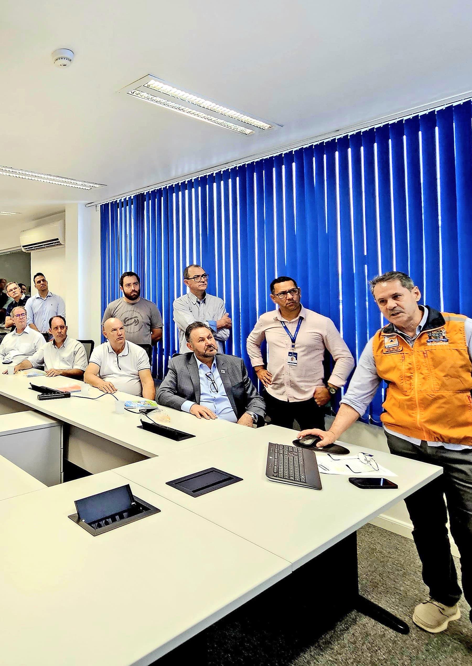 Comitiva regional durante reunião na sala de situação de Blumenau. Secretário da Defesa Civil, Carlos Menestrina, detalha que unidade conta com três diretorias, em hidrologia, geologia e meteorologia