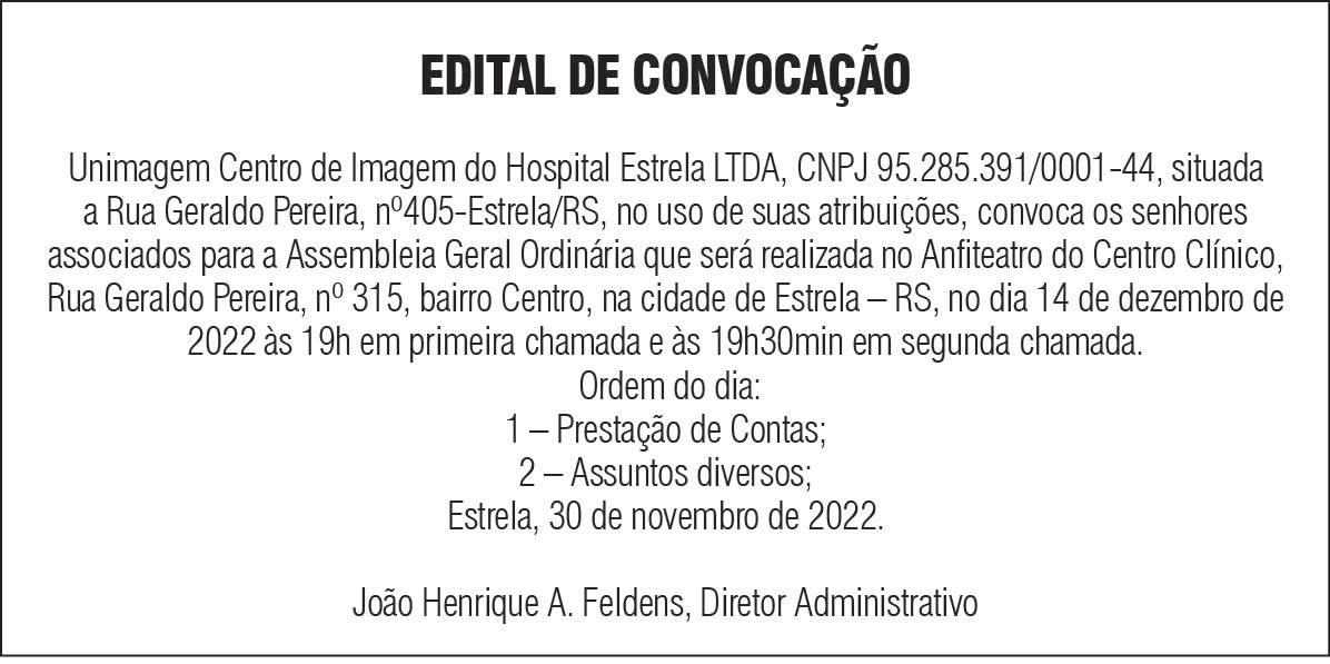 CIRCULAÇÃO • Estrela • Bom Retiro do Sul • Fazenda Vilanova • Colinas • Imigrante Disponível para verificação junto ao impressor (Gráfica Zero Hora) Diretor Executivo: Adair Weiss Diretor de Mercado e Estratégia: Fernando Weiss Diretor de Conteúdo Editorial: Rodrigo Martini Um semanário do Fundado em 13 de Janeiro de 1966 EXPEDIENTE Rua Treze de Maio, nº 360 Bairro Centro - Estrela/RS CEP: 95880-000 EDITORIAL FAÇA JÁ SUA ASSINATURA: 3712.1250 - VALOR ANUAL: R$ 230,00 À VISTA - CONSULTE VALORES A PRAZO