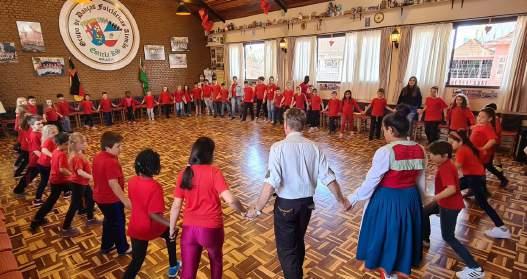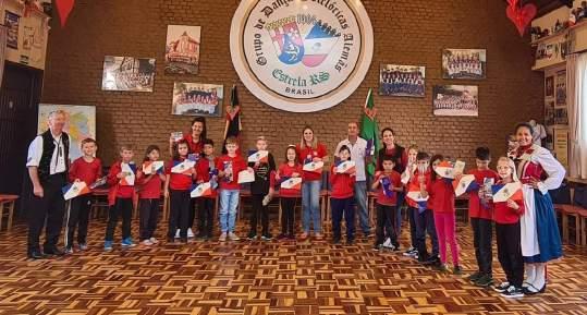 quase 60 anos. Além de um bate papo de informações gerais, o instrutor Andréas Hamester realizou o ensaio de três danças com os estudantes, que gostaram muito do momento. No final houve o sorteio de lembranças dos Grupos Folclóricos de Estrela como botons, copos decorativos, CD’s de música alemãs e material diverso.