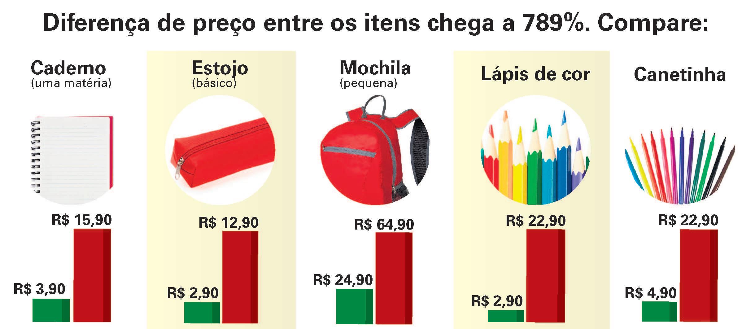 Um dos principais componentes do orçamento familiar no início do ano, os materiais escolares apresentam grande variação de preço conforme o fabricante. Produtos semelhantes e da mesma marca chegam a custar qua-