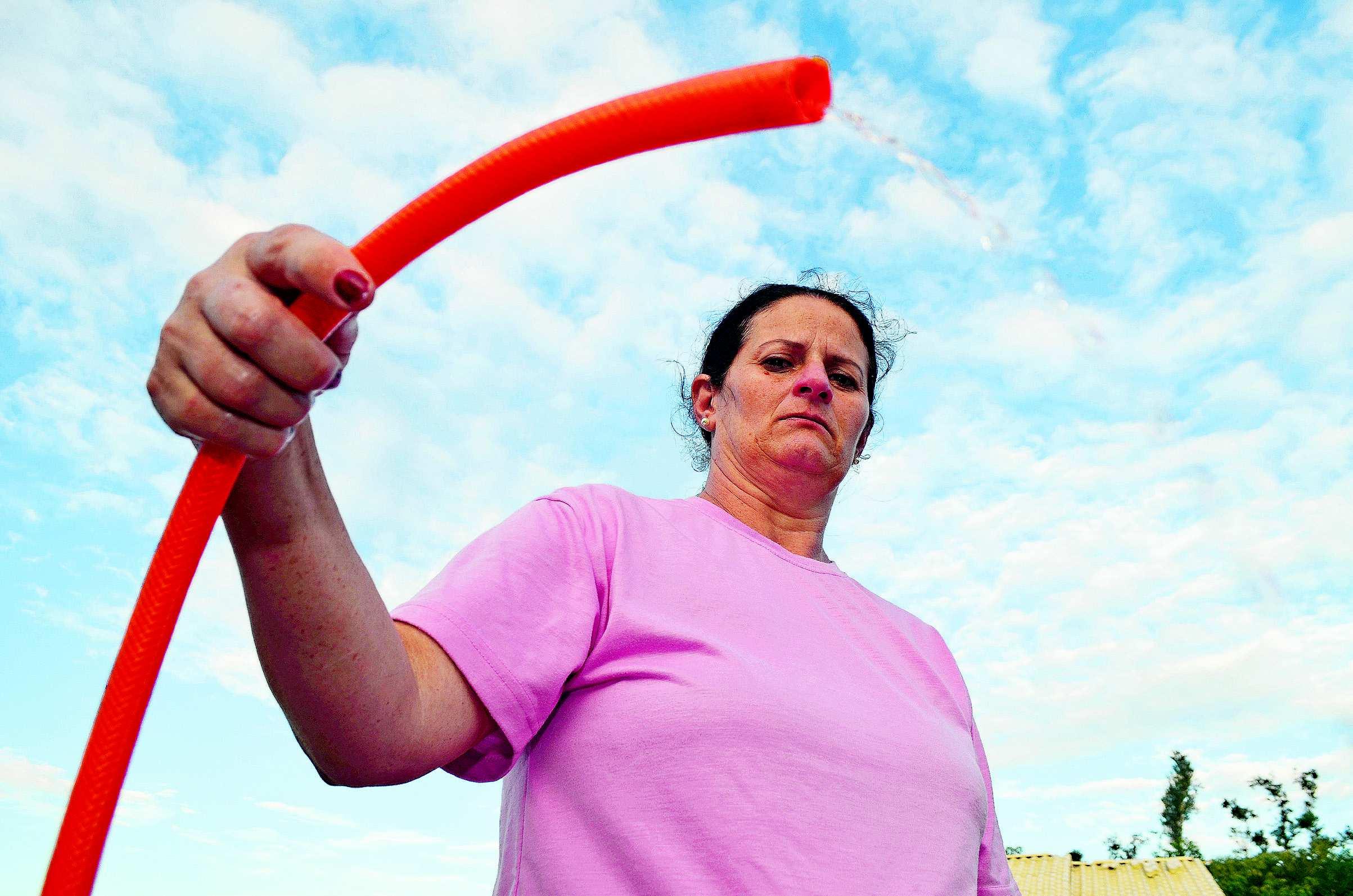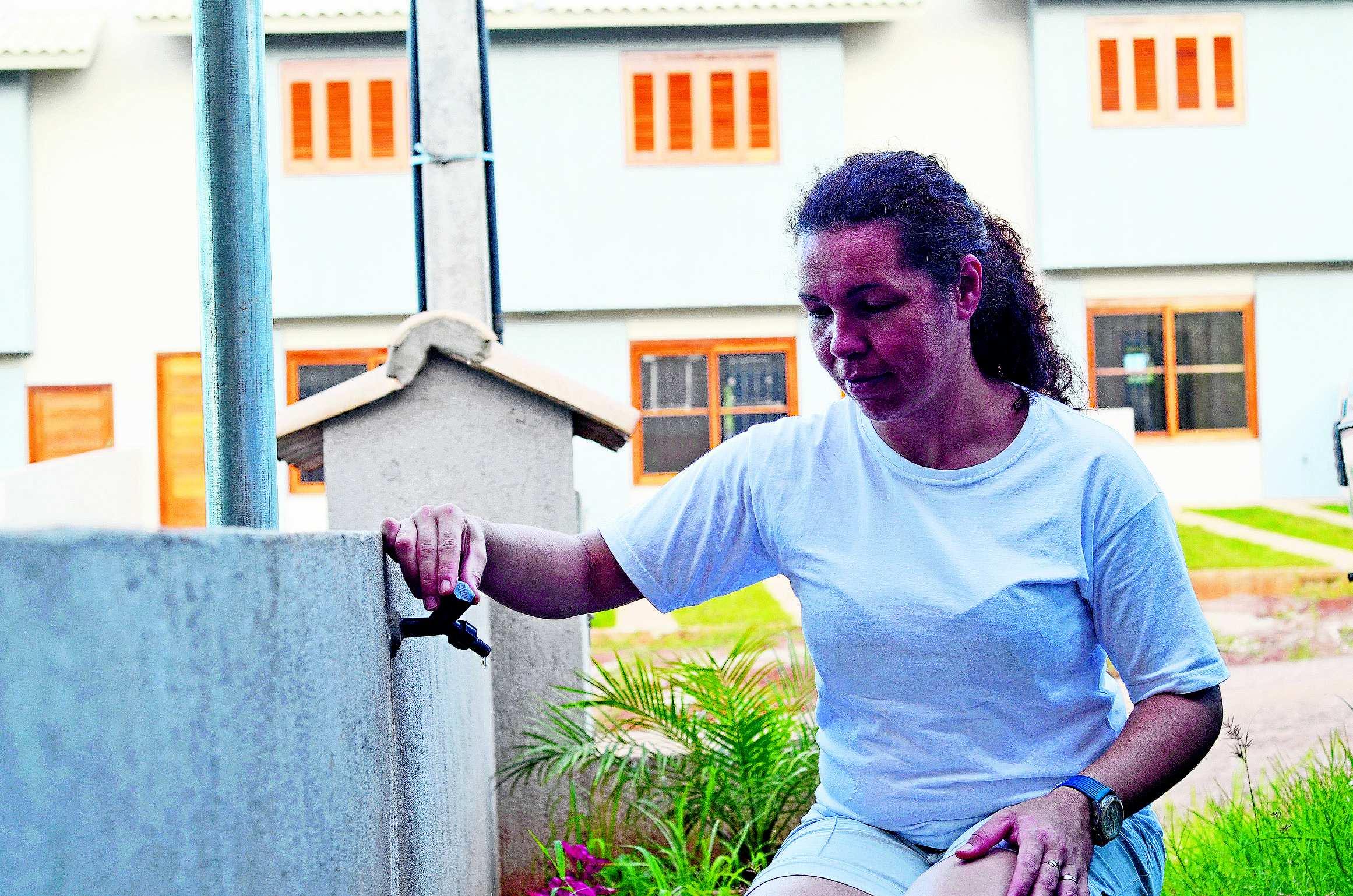 MUITO CALOR E FALTA DE ÁGUA: moradora do loteamento Bauer, Noêmia Krein, 47, é uma das prejudicadas pelos problemas no fornecimento. “Quando tem água, falta força”, diz. Aumento da população no bairro e danos na rede são as principais dificuldades Página 6