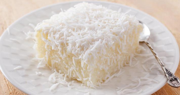Em assadeira untada e enfarinhada, coloque a mistura para assar a 280º C, por cerca de 35 minutos, até que o bolo esteja dourado por cima e completamente assado. Deixe o bolo esfriar enquanto faz a calda. Para a calda, coloque todos os ingredientes em uma panela. Deixe apenas o coco ralado de fora. Deixe engrossar, sempre mexendo, por cerca de 10 minutos. Corte o bolo em quadrados, molhe os pedaços na calda e depois passe no coco ralado. Embrulhe em papel alumínio e coloque na geladeira. Sirva gelado.