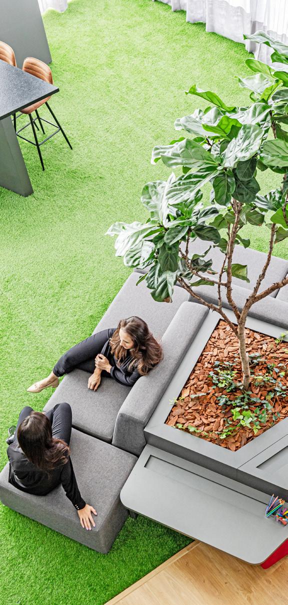 Posicionado estrategicamente em uma sala de esquina, o escritório foi pensado como uma extensão da praça da Lyall, convidando os visitantes a também vivenciarem bons momentos neste espaço de negócios. Por isso, ao chegarem no local, os visitantes pisam em grama sintética, acompanhada de estofados confortáveis e árvores naturais, fazendo a conexão com o exterior.