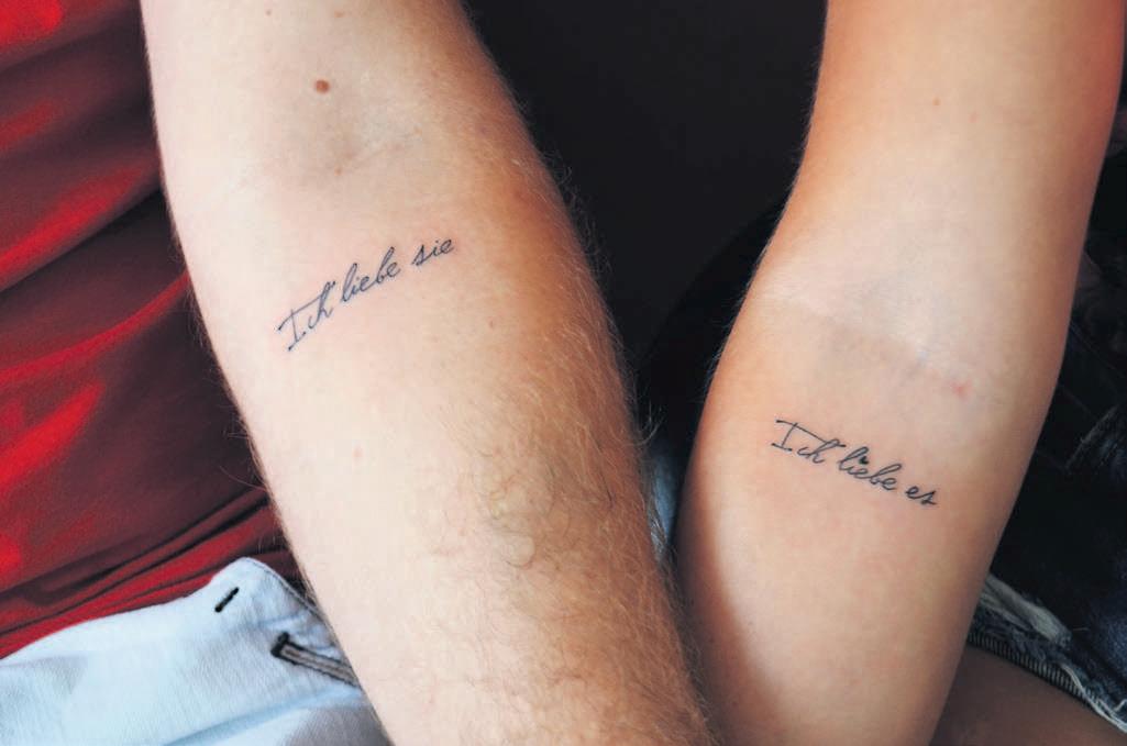 Depois de poucos minutos, estava pronta: a pequena frase homenageia o namorado Roni Wünsch. Sentado ao lado da amada, ele aguardava o resultado.Suafrasededicadaaelajáestava marcada na pele. “A minha diz 'eu amo ela', e a dela diz 'eu amo ele'”, conta.