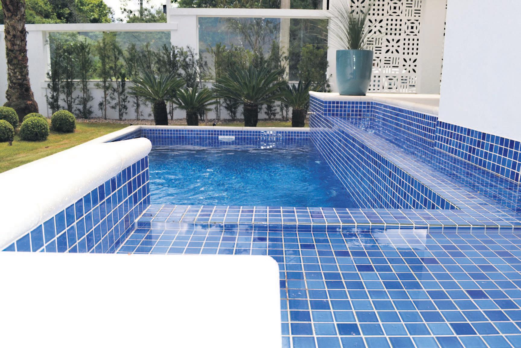 -determinado, as piscinas de pastilhas de vinil podem ser montadas nos mais diversos modelos e tamanhos. “Serve para os clientes que buscam algo diferenciado ou para adequar ao espaço existente na residência.”