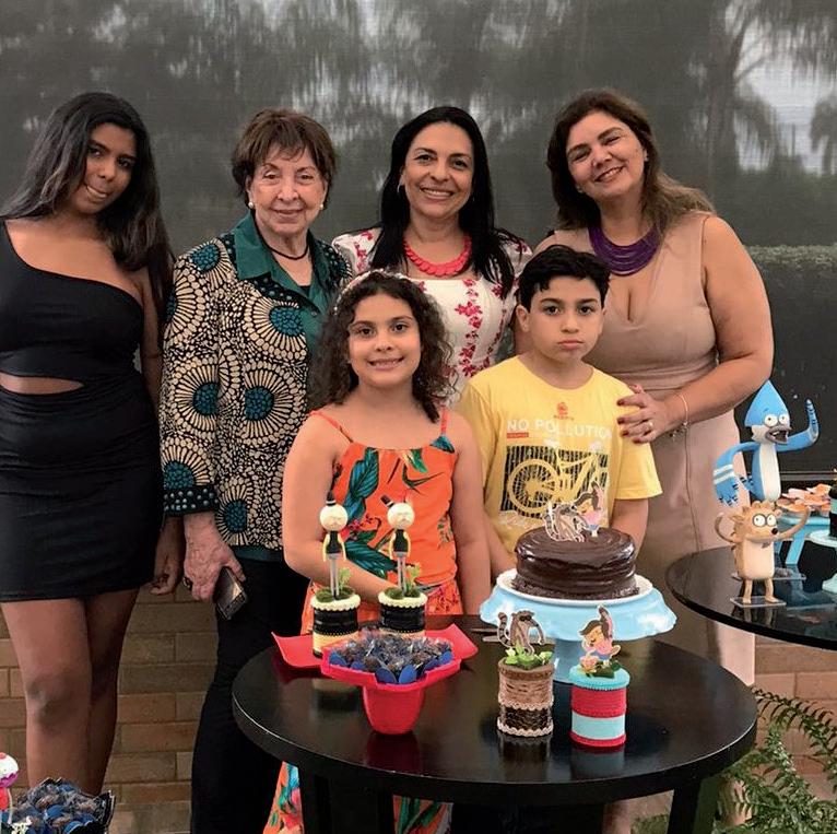 O aniversariante com sua turma, na hora do parabéns Marcela e a mãe, Flávia Lira, com a titular da coluna, Aida, Marianna e o aniversariante