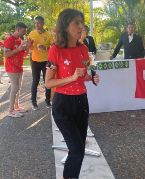 Com decoração das cores do Brasil e da Suíça, o embaixador Pietro Lazzeri e embaixatriz receberam amigos, diplomatas e imprensa para acompanharem a partida entre as duas seleções. Os convidados foram recebidos com alegria pelo casal anfi trião, antes de começar a partida, foi servido um buffet de comidas típicas preparados pela Chef Cristiane Lima