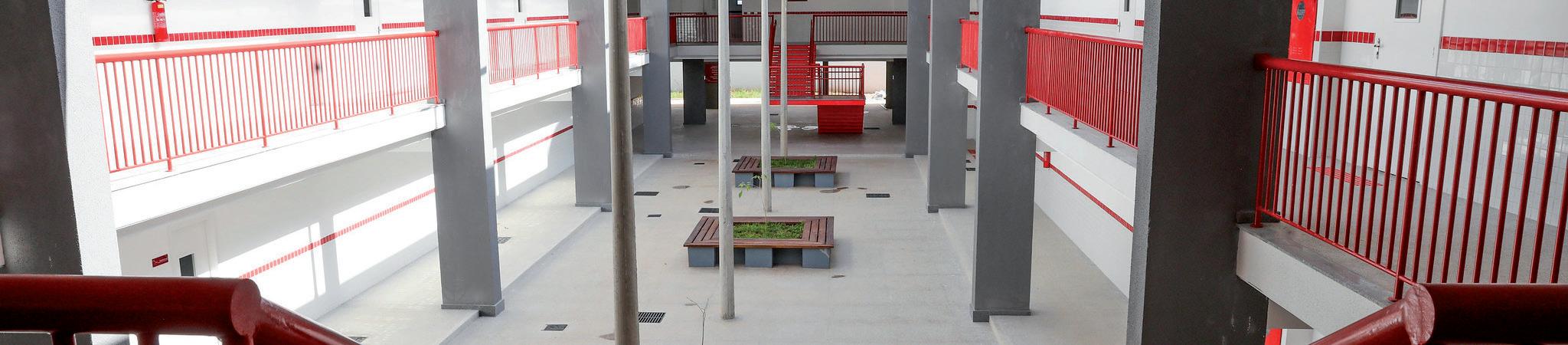 tura, jardinagem e limpeza. O prédio segue o padrão estabelecido pelo FNDE. São 5.577,39 metros quadrados de área construída com 12 salas de aula, cinco laboratórios, auditório, biblioteca, ginásio coberto, depósito de materiais, secretaria, recepção, sala dos professores e de coordenação, diretoria,
