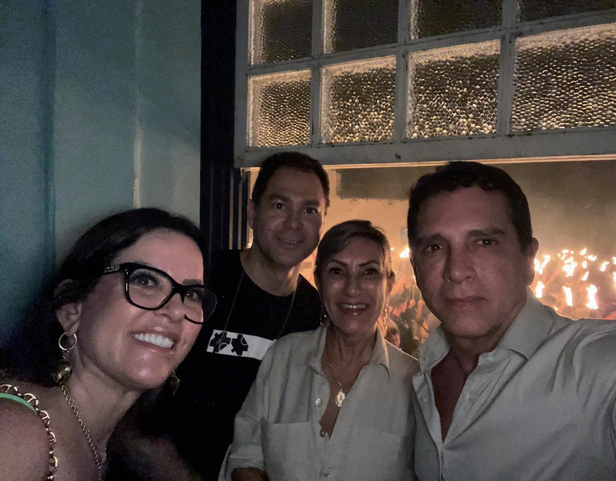 Edval, Moema e o cardiologista Brasil Caído, em companhia de Lara Morais, que mora em Milão, estiveram em Goiás Velho, para participar da celebração da Semana Santa. Na foto, o grupo da família que preserva a religiosidade e tradição, durante a procissão do Fogaréu, um dos momentos de maior fé e emoção da temporada