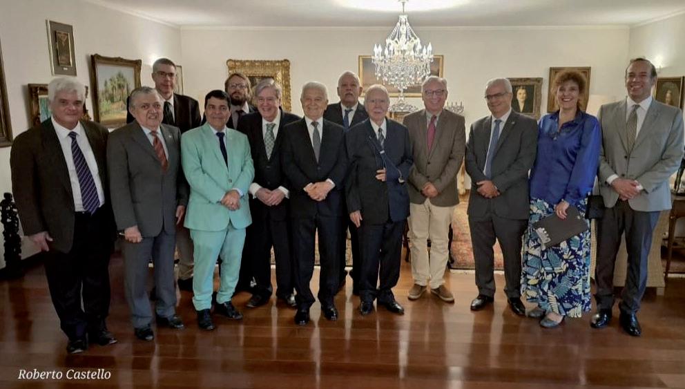 A foto oficial da cerimônia para os arquivos do Instituto Castelo Branco cumprimentndo o ex- presidente e novo acadêmico