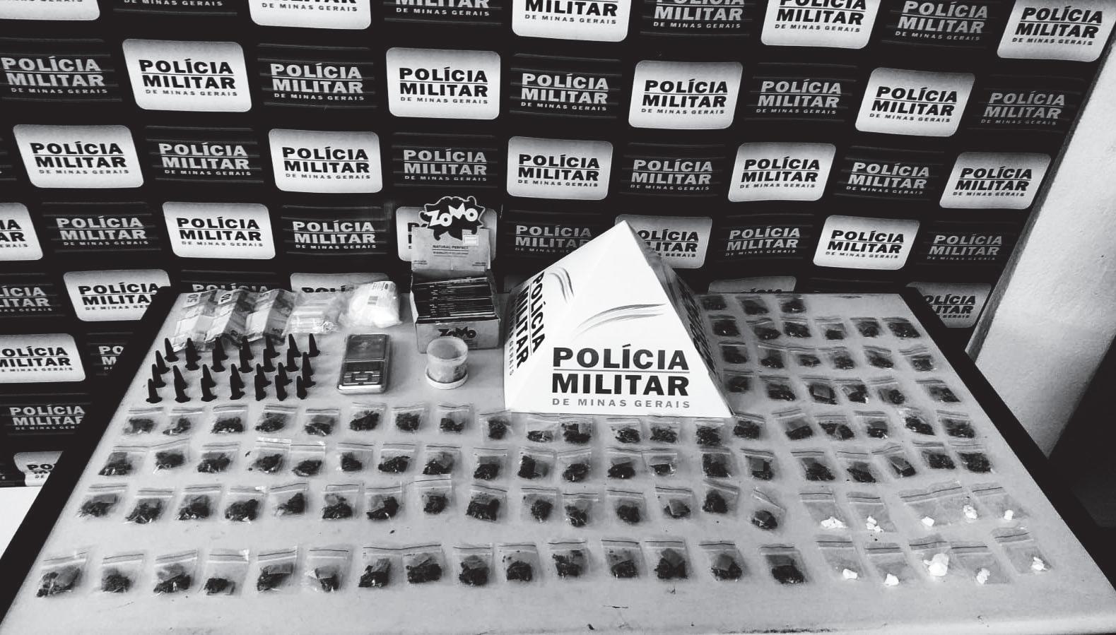 Com os dois, os policiais encontraram 91 buchas de maconha, sementes da droga, 10 porções de cocaína, materiais para embalar os tóxicos, uma balança de precisão e R$75,00.