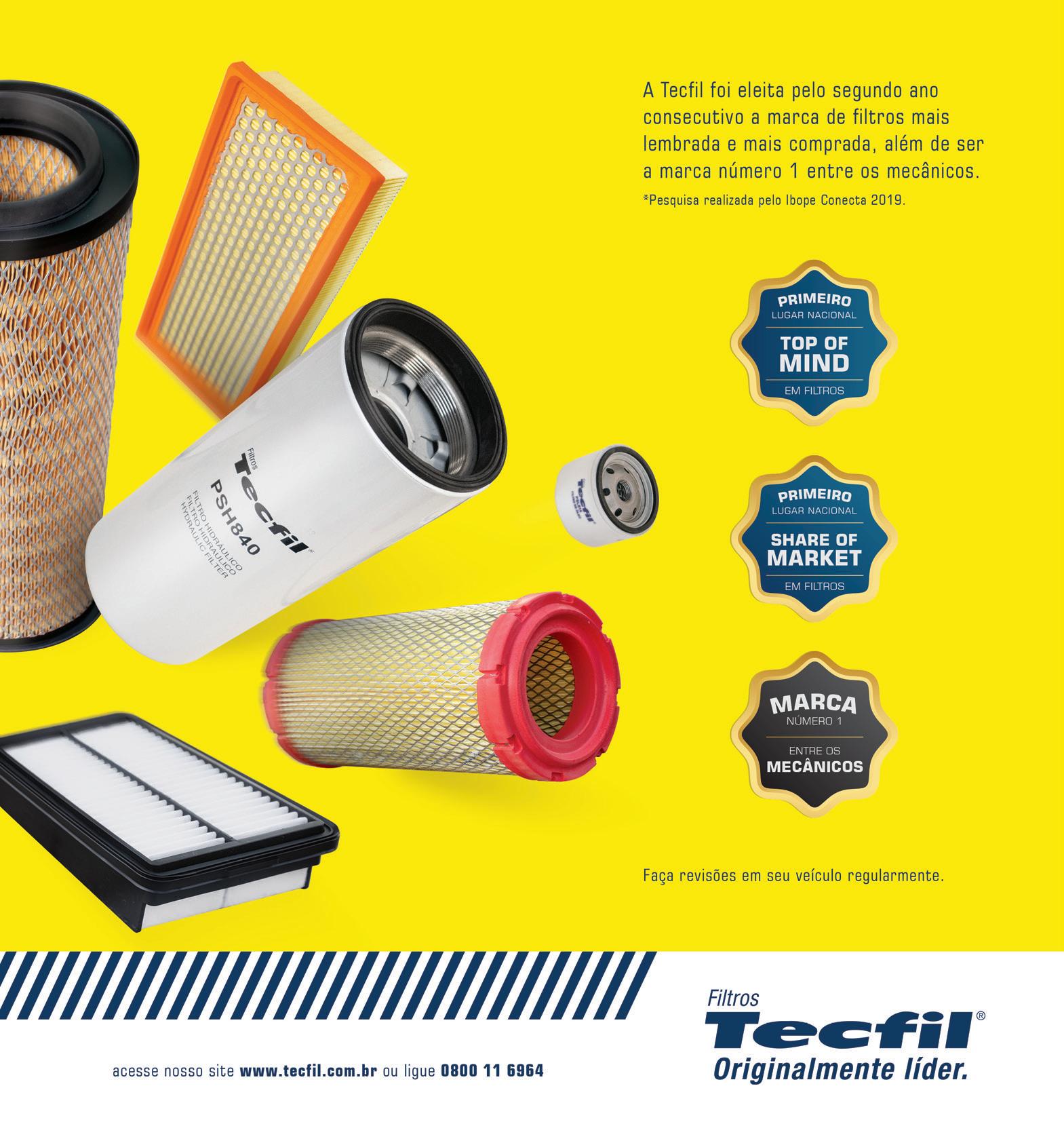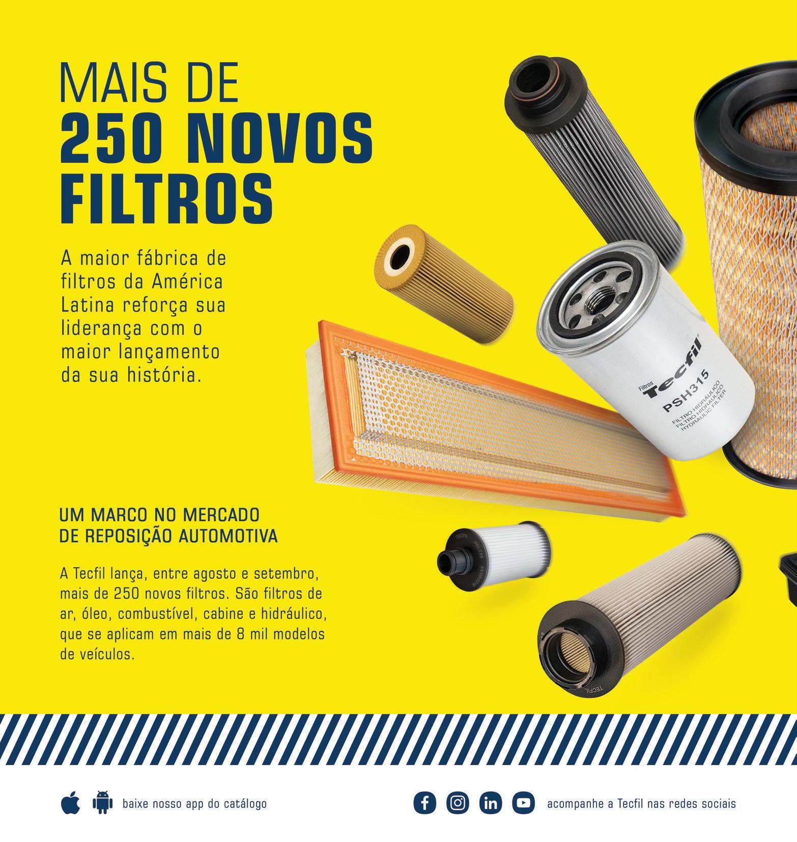 Fabricante de filtros automotivos, a Tecfil lançará mais de 250 novos tipos de filtros no mercado brasileiro, no prazo de apenas dois meses, entre agosto e setembro. O aumento de seu catálogo em quase 20% visa atender todos os segmentos de veículos –automóveis, ônibus, caminhões e equipamentos agrícolas –, e dar cobertura completa às demandas de seus clientes, de montadoras e repositores até consumidores finais. São filtros de ar, óleo, combustível, hidráulico e para cabine, que se aplicam em mais de 8 mil modelos de veículos.