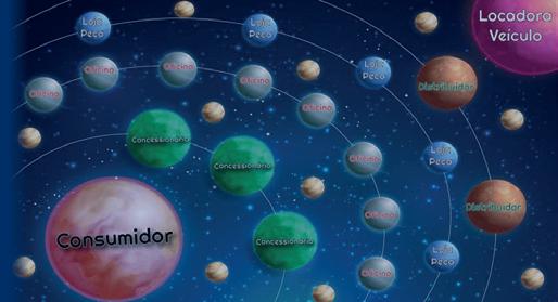 “Existem ainda nesse universo planetas menores que são as seguradoras, empresas de softwares, fornecedores de equipamentos, um rol de empresas que orbita nesse setor em número incomensurável. Temos ainda outro astro, que são as locadoras de veículos, inseridas nesse slide simbolicamente porque têm praticamente vida própria e toda manutenção depois da garantia fica dentro do negócio deles”, detalhou Alvarenga.