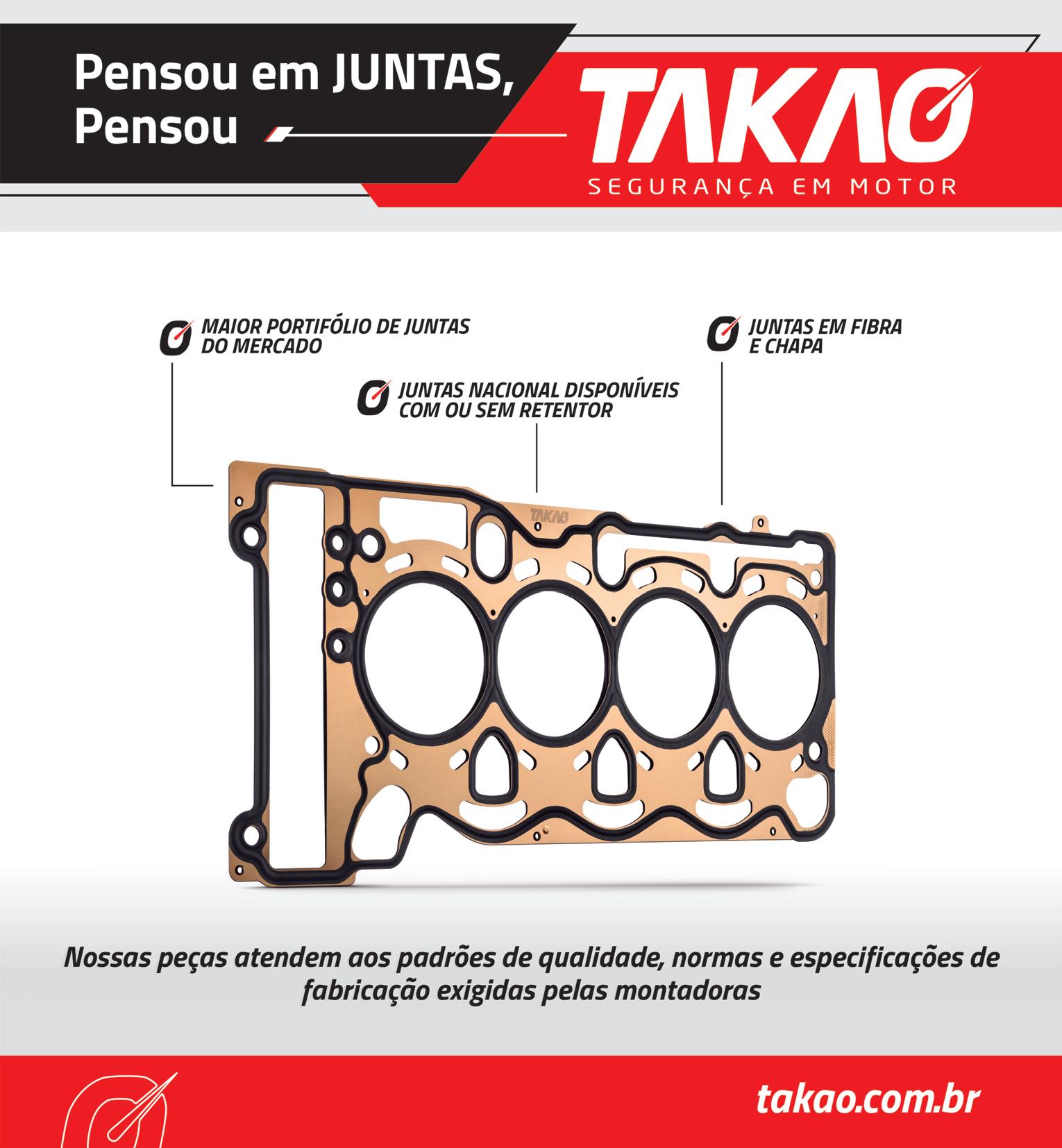 m todo início de ano, a Takao, marca 100% brasileira e com atuação no segmento de reposição para peças de motores há nove anos, faz um estudo de mercado com o objetivo de manter seu portfólio atualizado, disponibilizando novos itens. A empresa possui uma carteira de produtos que abrange 92% de toda a frota nacional: composta por pistões, anéis, bronzinas, juntas, comandos, válvulas e diversos outros componentes internos de motores. São mais de 16 mil itens distribuídos para 1.300 motores diferentes. EM FEVEREIRO, EMPRESA MOSTRA 49 PEÇAS DE REPOSIÇÃO PARA MOTORES DE CARROS RECÉM-LANÇADOS
