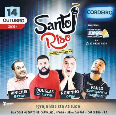 Nova Friburgo também rece berá o espetáculo “Santo Riso”. A cidade recebe o evento na quinta-feira, dia 13 de outubro, às 20h. O show será realizado no Quadrangular Church, na Avenida Július Arp, 440, em Olaria.
