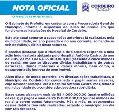 tal não fosse vendido, montando inclusive um novo projeto para a unidade, que deverá ser conhecido em breve. Em nota oficial (abaixo), a Prefeitura de Cordeiro, através do Gabinete do Prefeito, em conjunto com a Procuradoria Geral do Município, informou a suspensão do leilão do prédio em que funciona o hospital.