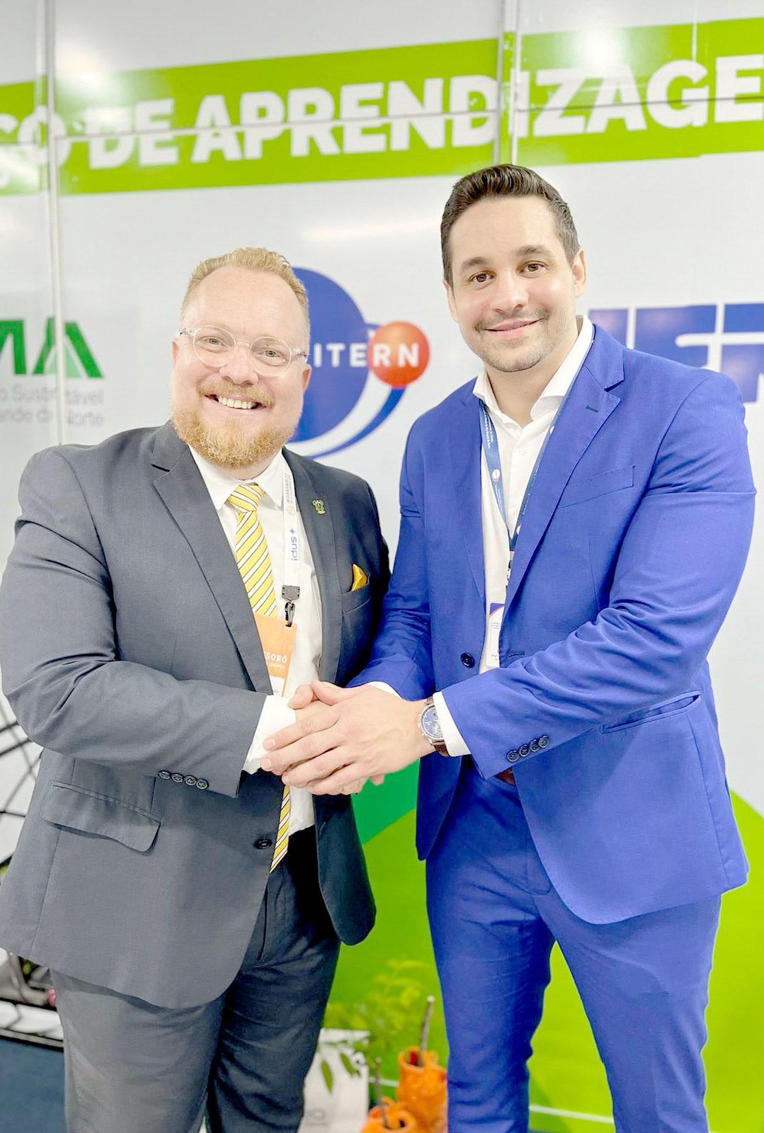 Rafael Rodrigues, Presidente da FUNCITERN, recebendo Hugo Fonseca, Secretárioadjunto da secretaria do Desenvolvimento Econômico, da Ciência, da Tecnologia e da Inovação do RN, na Mossoró Oil e Gás Energy.