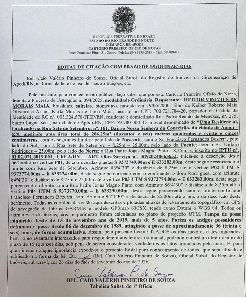SERRINHA DOS PINTOS-RN - 26/02/2026. KAIO LEMOS RODRIGUES DE SOUSA PREGOEIRO(A).