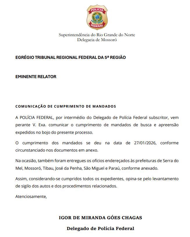 “Poucos dias depois, a Polícia Federal comunicou oficialmente o cumprimento das medidas. Em manifestação datada de 1º de fevereiro de 2026, o delegado Igor de Miranda Góes Chagas informou que os mandados de busca e apreensão haviam sido cumpridos em 27 de janeiro, além da entrega de ofícios às prefeituras envolvidas. No mesmo documento, a PF concluiu que todas as providências haviam sido executadas e se posicionou expressamente pelo fim do sigilo”, noticiou o Dina. “Assim, considerando-se cumpridos todos os expedientes, opinase pelo levantamento de sigilo dos autos e dos procedimentos relacionados”, escreveu o delegado. Somente após esse enca-