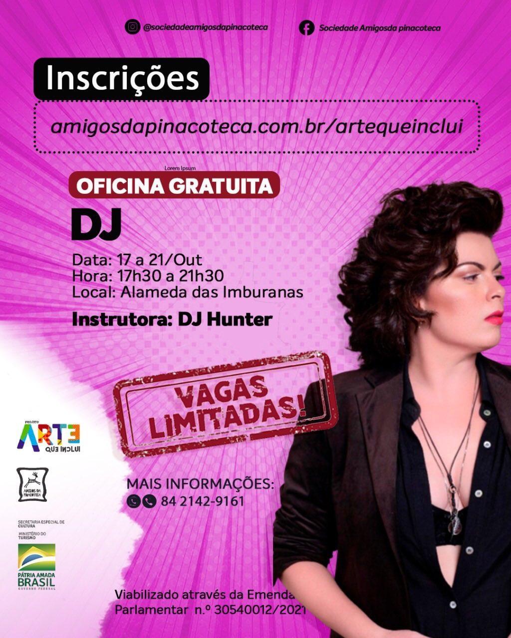 do Fernandes, de Marketing Pessoal (24 a 28/10), com a jornalista Nathália Rebouças; e a oficina de Fotografia em Celular (24 a 28/10), com o fotógrafo Pacífico Medeiros. Já a oficina de DJ (17), com DJ Hunter, será realizada na Alameda das Imburanas.