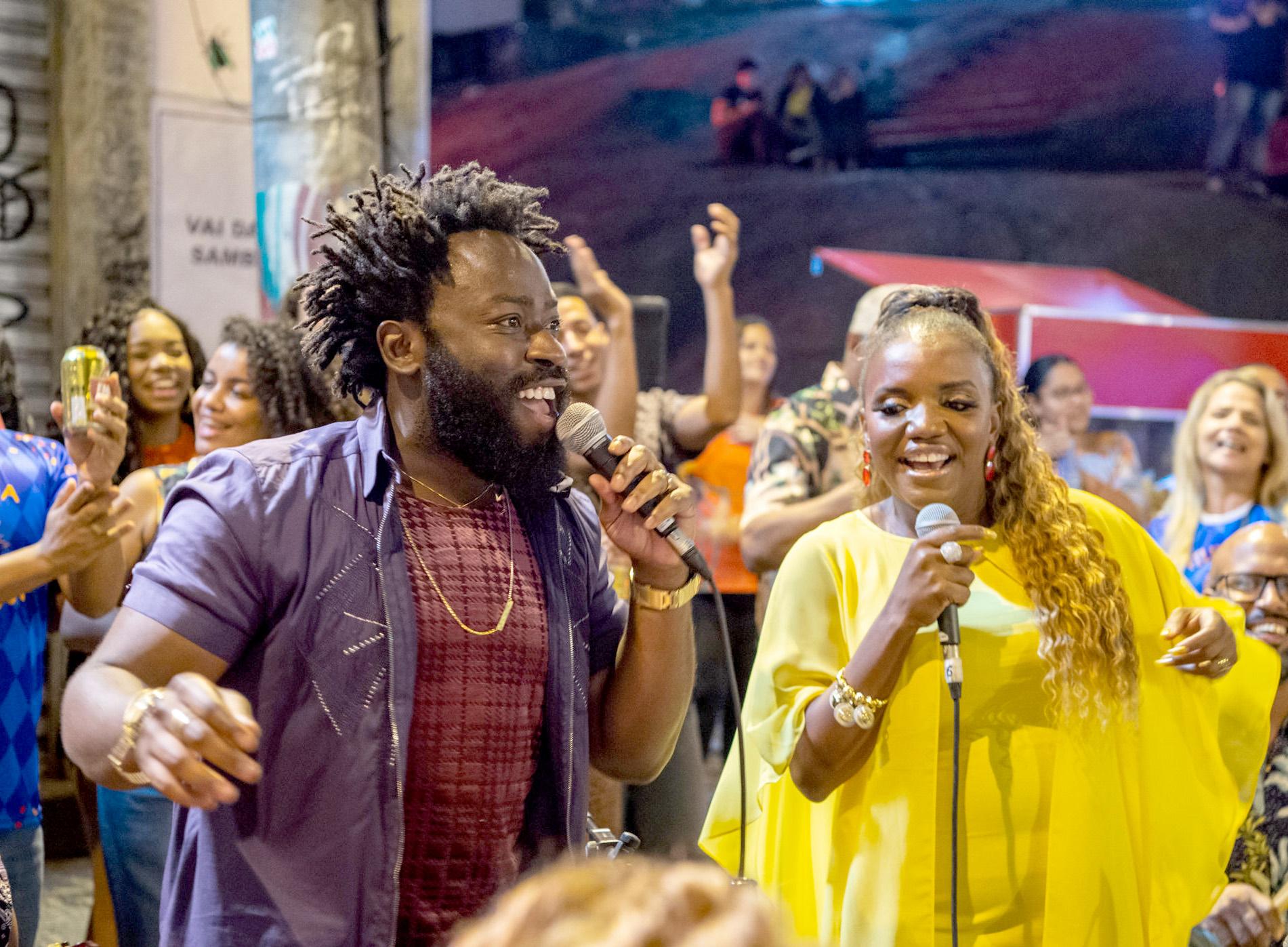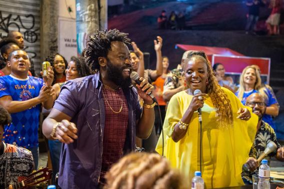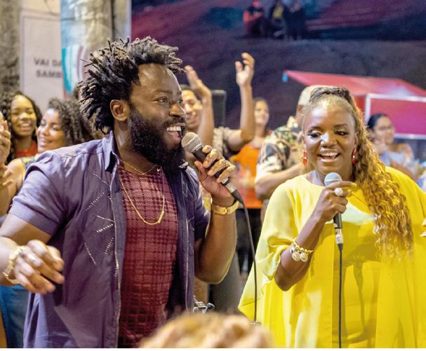 O cantor Xande de Pilares vi verá Seu Darci, porteiro da loja de luxo Rhodes & Co. Tail leur e mestre de bateria do bloco de carnaval Filhos da Gamboa. Considerado por to dos no bairro como modelo de pai de família e homem bonachão, Darci acolhe em sua casa uma série de parentes. “Seu Darci é a referência de paz, ele é um cara do bem. Me identifi co muito com o meu persona gem; não guardamos mágoas, não temos inimigos e o elenco e amigos em volta também aju dam a gente a ir seguindo as sim”, explica Xande, que faz sua estreia no universo das novelas. “Sou noveleiro. Mas nunca imaginei que um dia eu fosse participar do que eu as sistia. Estou me sentindo mui to acolhido”, completa.