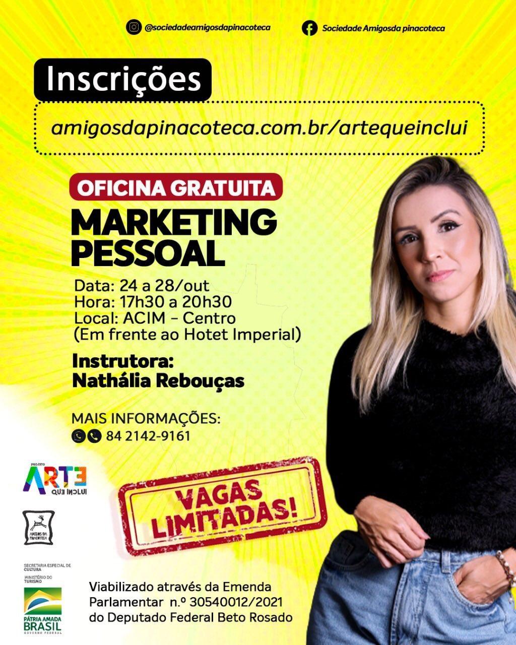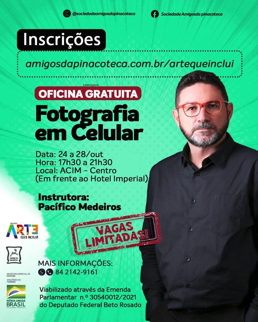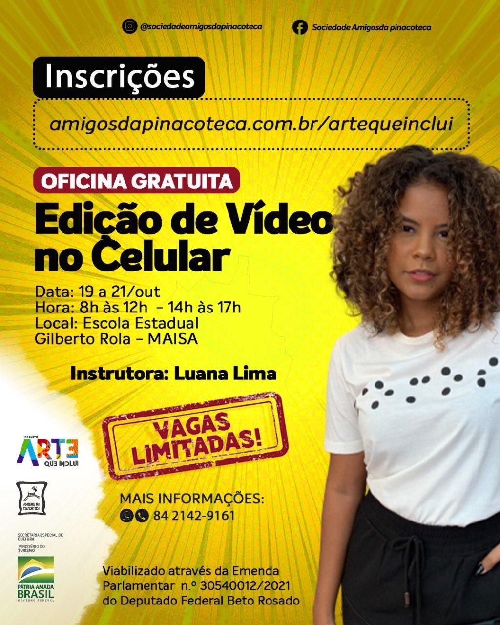 No momento, as inscrições estão abertas para seis oficinas com temas variados, sendo quatro na Zona Ur bana, e duas na Zona Rural. Na co munidade Maísa, os alunos da Esco la Estadual Gilberto Rola terão a oportunidade de se inscrever nas ofi cinas de Edição de Vídeo no Celular (19 a 21/10), com a instrutora Luana Lima, e na oficina de Marketing Pes soal (25 a 27/10), ministrada pela jornalista Ana Cláudia Barbalho. Já na Zona Urbana, as oficinas aconte cem em dois locais, na sede da Asso ciação Comercial e Industrial de Mossoró (ACIM), que fica em frente ao Hotel Imperial, no centro da cidade, e na Alameda das Imburanas.